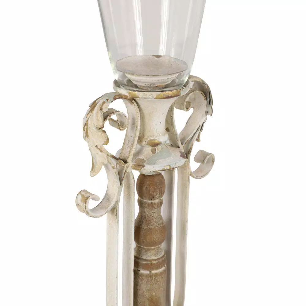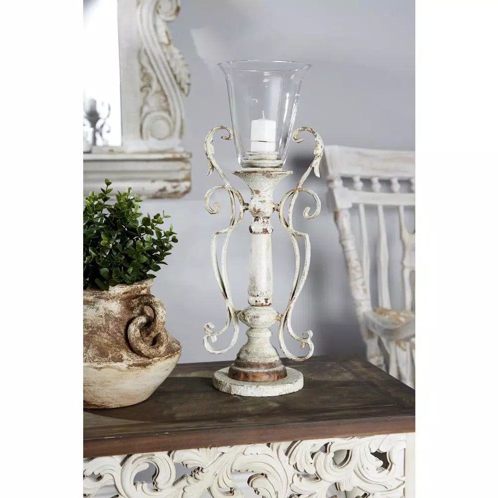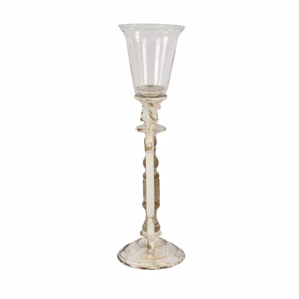 - White candle holder with bronze textural detail and layers of chipped and worn paint revealing muted green for an antique look; Chinese fir wood detail at the base; hurricane glass cover for pillar candle plate