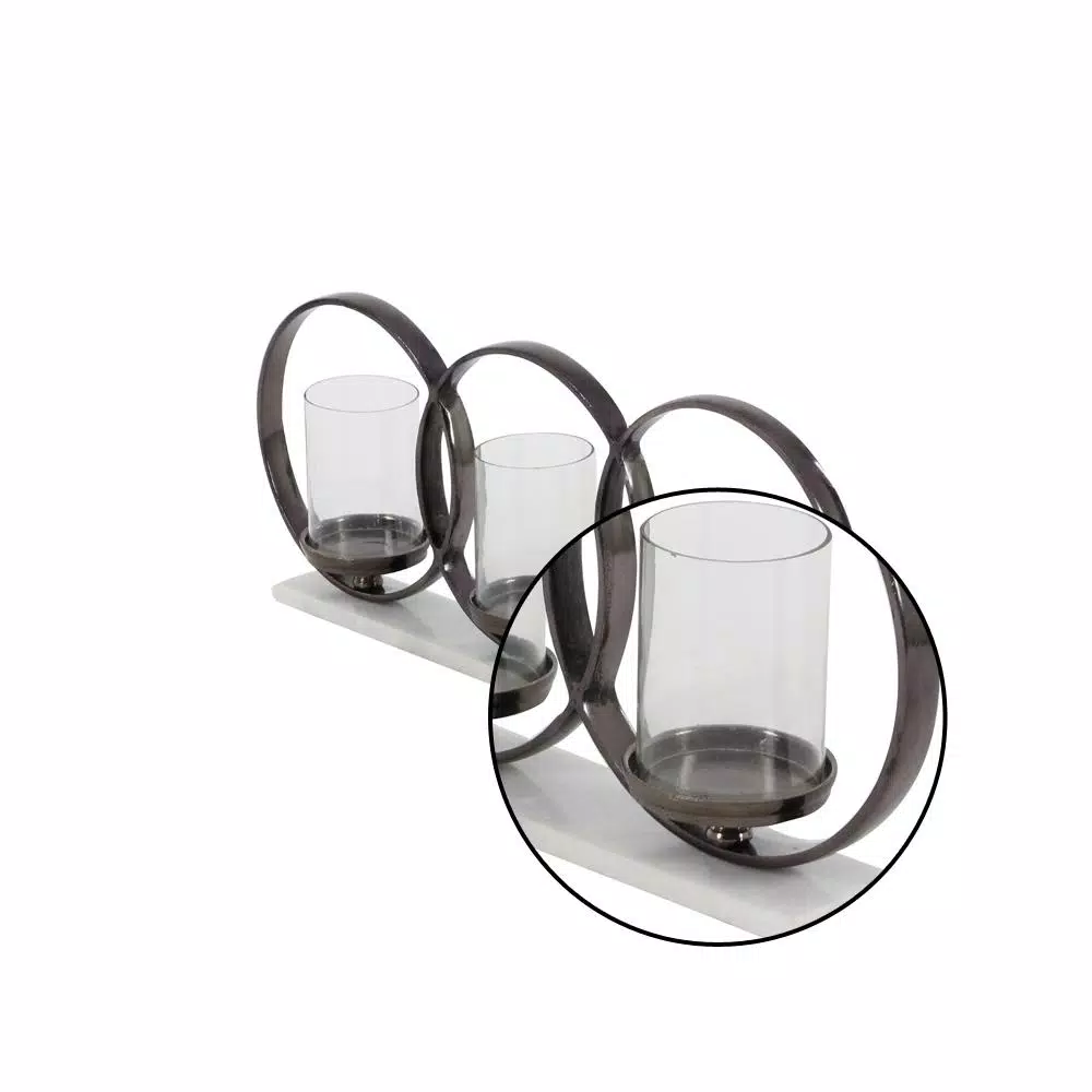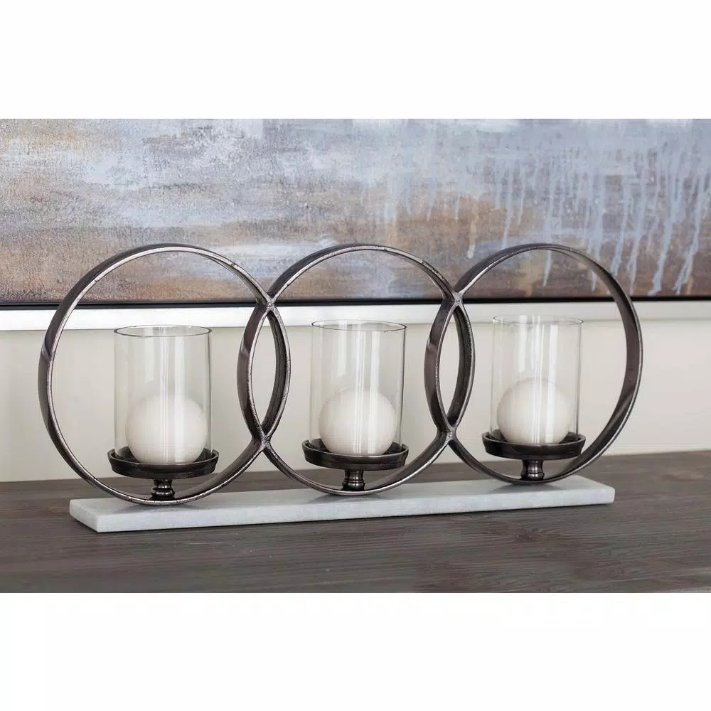 - 21″ x 9″ Touch of Glass metal marble glass candle holder, features three linked metallic black aluminum circles with candle plates inside, clear cylindrical glass shades, rectangular white marble base, (candles not included)