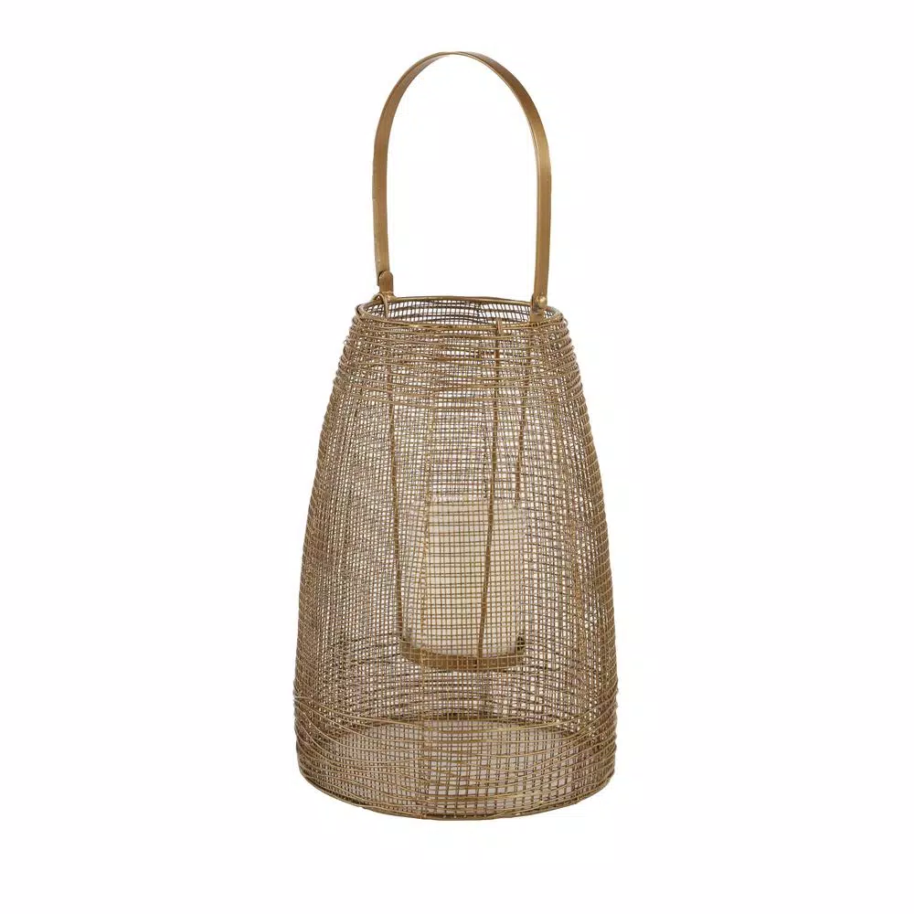 - Tall, round lantern that tapers at the top; dark golden bronze hue throughout the metal mesh body; suspended interior candle holder; large metal handle