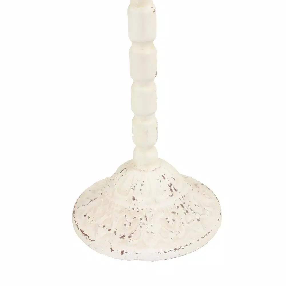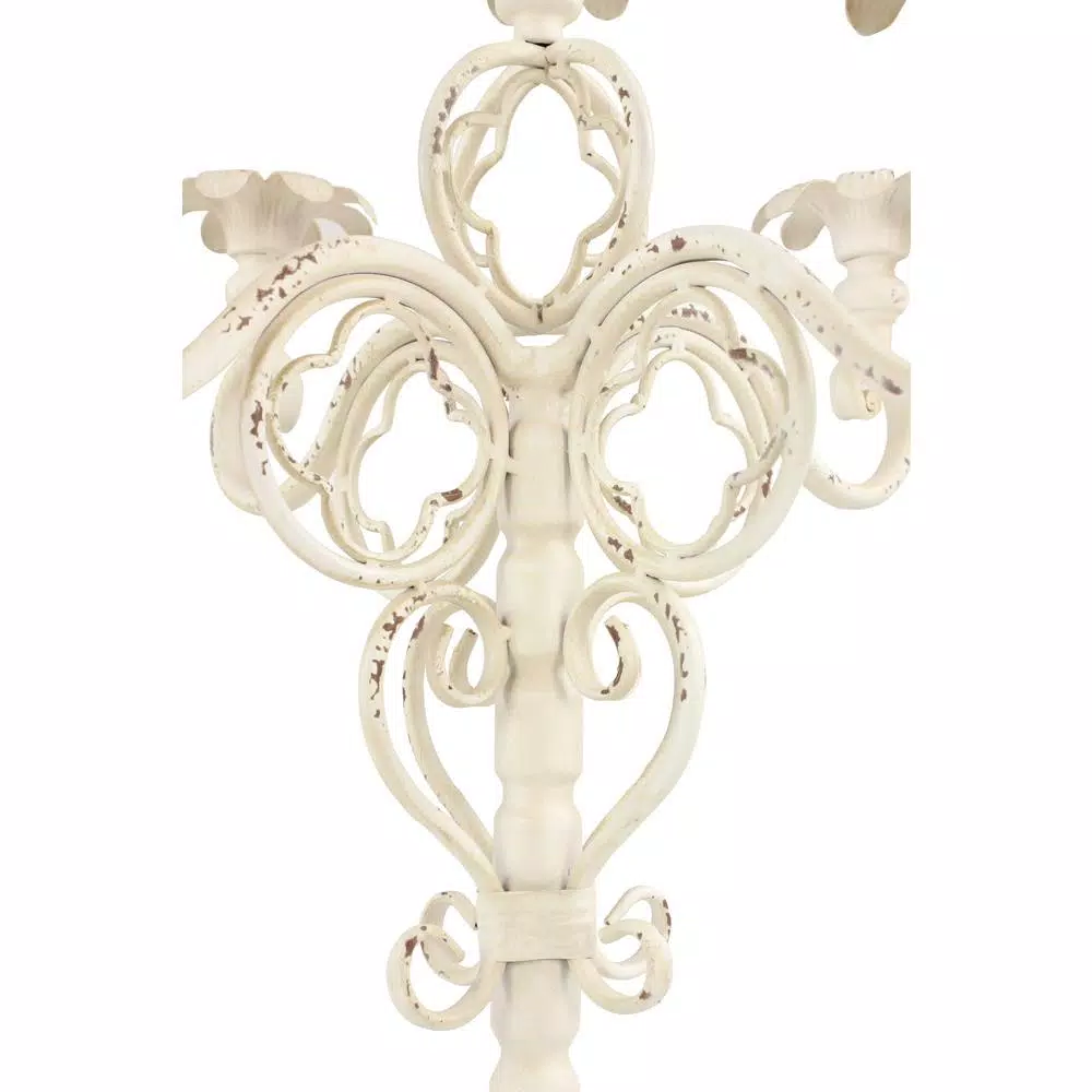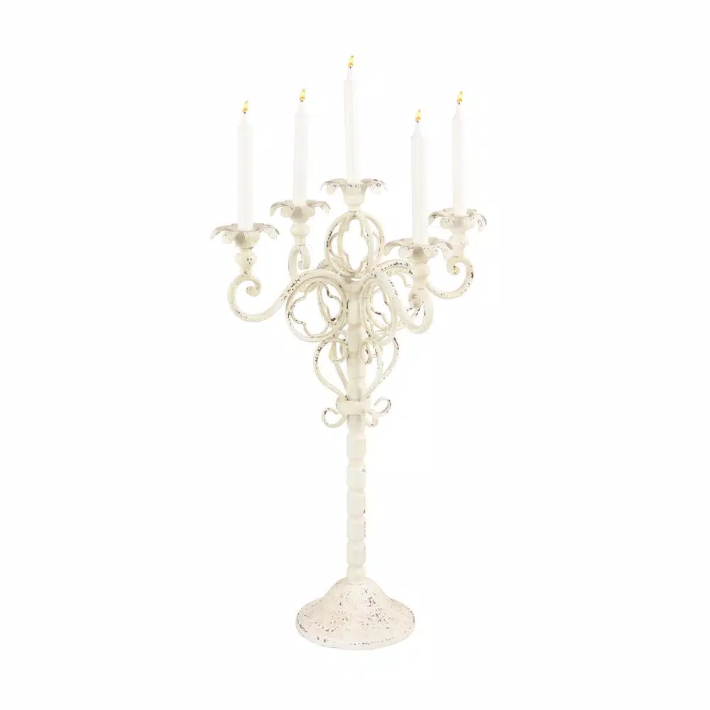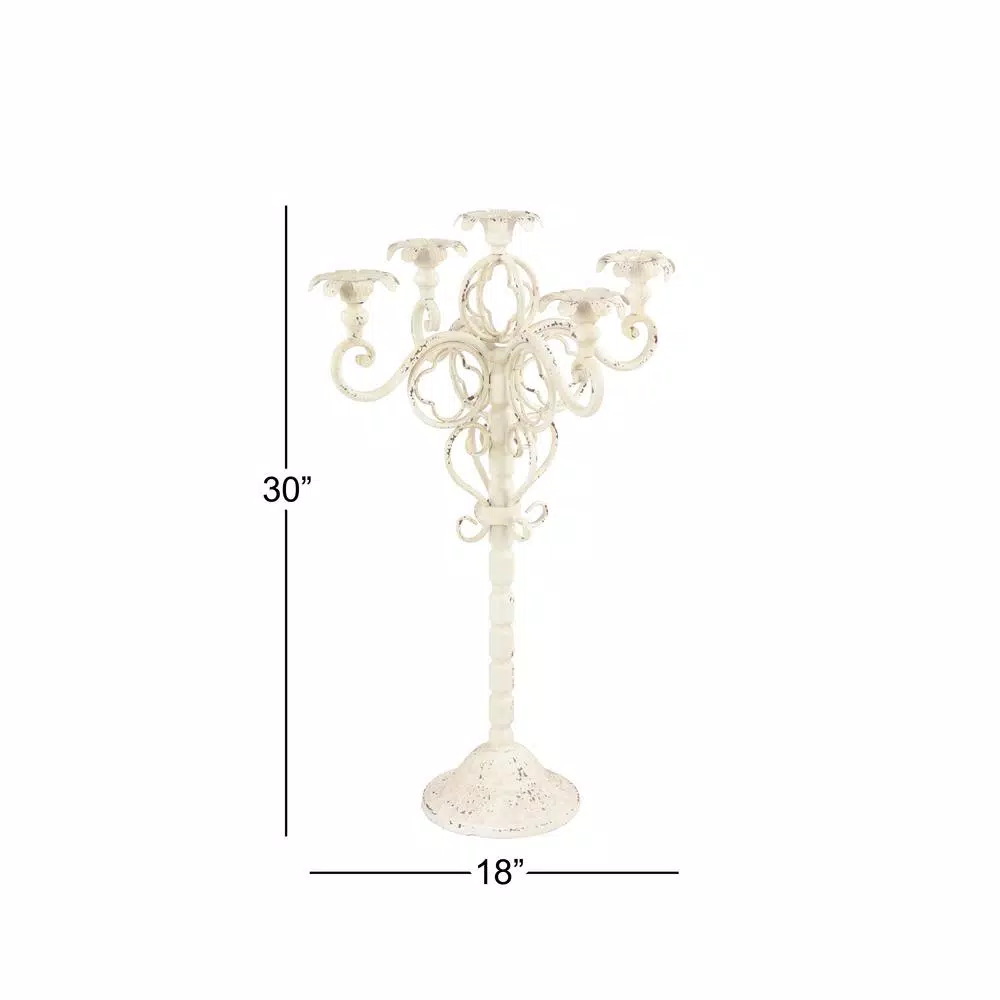 Add antique scrollwork coupled with ambient lighting to your space with this tall, distressed white metal candelabra. Prominently displaying 5 taper candle holders, this tall candle tree has a neutral antique white finish with distressing for a vintage look. The scrolled arms and carved post and base also add antiquated looks and dimension while supporting the iron candelabra at the top. This accent décor is a lovely lighting touch in your entryway, living room, or dining room, bringing soft illumination with vintage style.