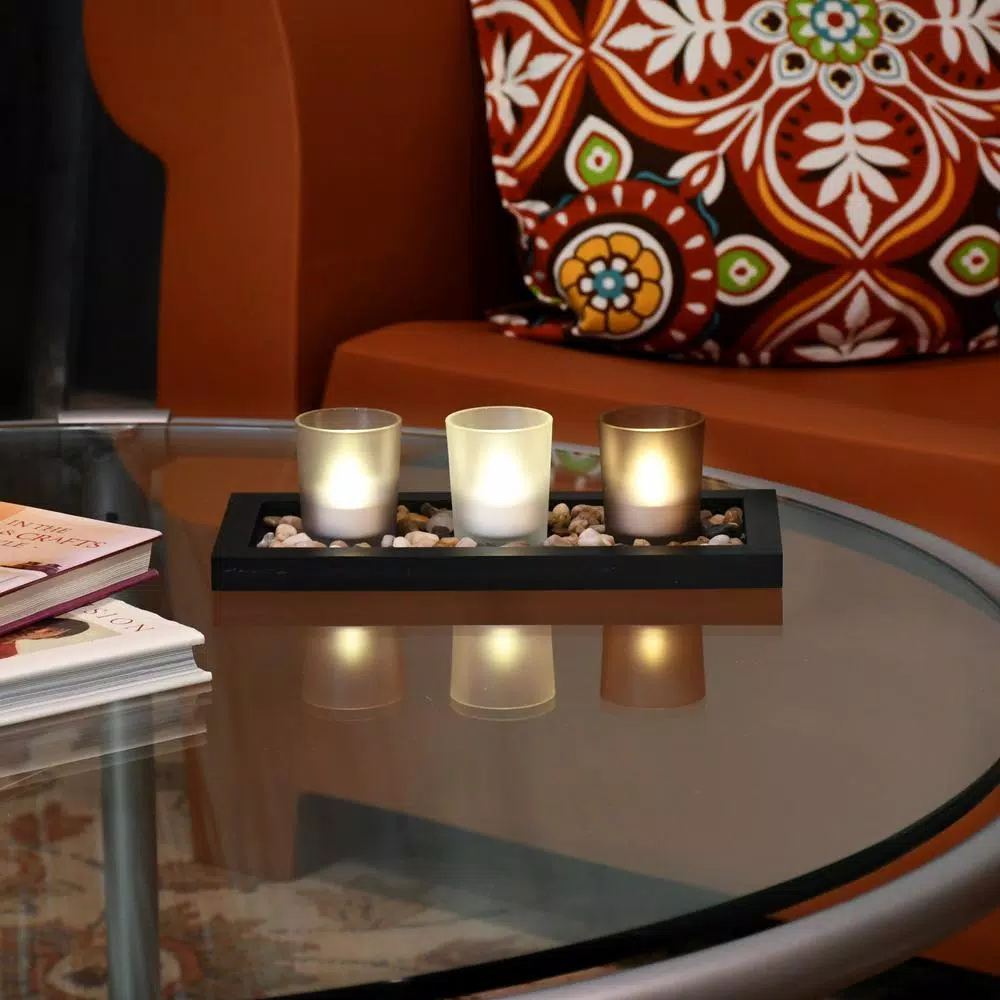 Create an rustic outdoor atmosphere indoors with this earth tone pebble candle tray. This wooden candle tray painted in a warm soft black comes with three frosted earth tone glass candleholders and smooth pebbles. The glass candleholders will hold a wax tea light candle, LED tea light or votive candle (not included).
