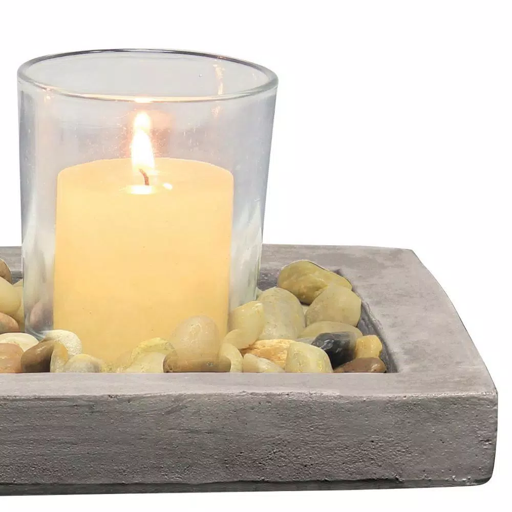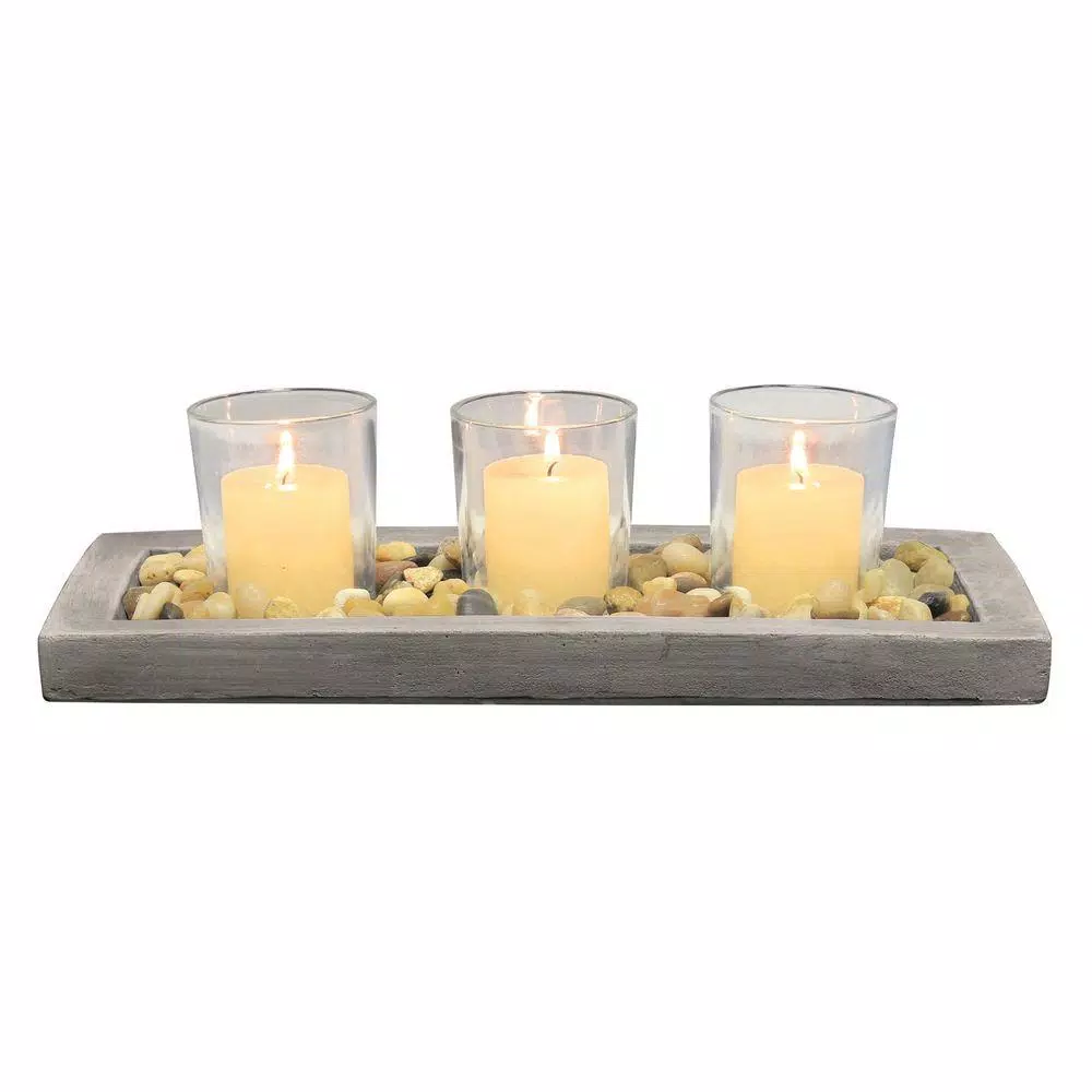 Accent your home with the 3-Votive Candle garden. It is a simple, natural-colored rectangular frame filled with glass holders and small pebbles. Designed from cement, it makes a lovely and durable accent indoors and outdoors. Purchase your favorite colored or scented votive separately for the small garden candle arrangement. This beautiful item creates a relaxing, meditative atmosphere and is ideal for areas with limited surface space for decor.
