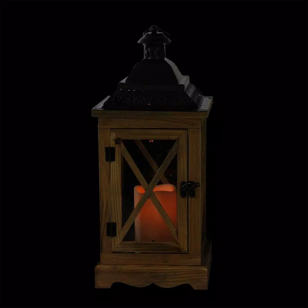 Rustic natural wooden lantern has glass panes and an elegant cut-out brown metal top Beige bisque flameless pillar candle has the look of a real wax candle with the safety of battery operation Amber colored flame has a slight flicker Candle has two operation options; on/off and timer function Timer function will keep the candle on for 5 hours and then automatically go off. Candle will automatically come on at the same time the next day. On/off and timer switch on bottom Candle uses (3) in. AAA in. size batteries (included) LED light is cool to the touch Dimensions: 17.5 in. H x 7.5 in. W x 7.5 in. D Material(s): wood/metal/glass/resin/plastic.