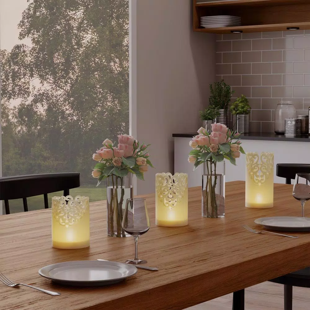 Add a uniquely beautiful, ambient touch to your home decor with the Lace Design Flameless Candle Set with Remote Control (Set of 3) by Lavish Home. The vanilla-scented real wax candles feature an intricate laser cut lace detailing and will add a gorgeous glow to your home. The LED candles are battery operated and conveniently come with an 8-key remote, so you can easily control the power, timer, brightness, and the flickering or steady flame option with the push of a button. This charming candle set is sure to enhance any living room, bedroom, dining room or kitchen, and even makes a perfect gift and party table lighting for events and occasions like housewarmings, weddings, showers, birthdays, and more.