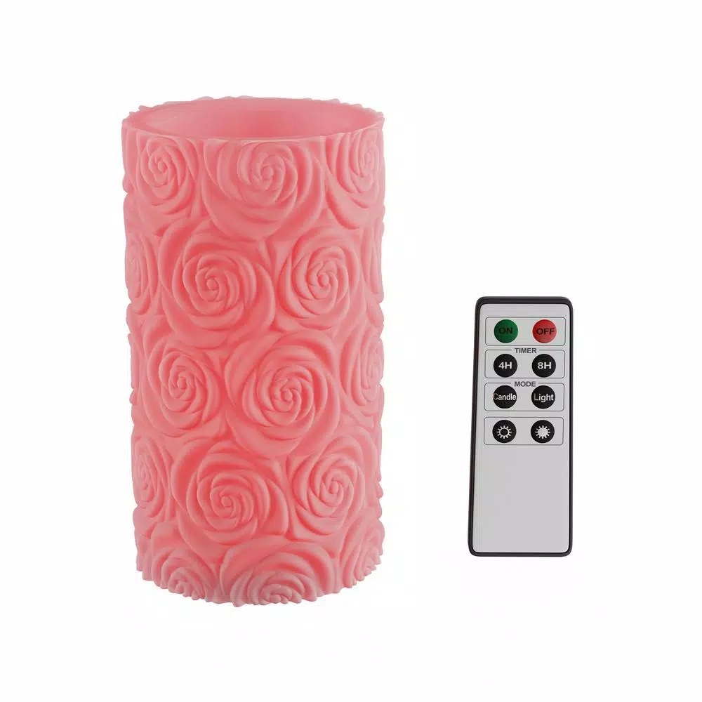 Add a uniquely beautiful, ambient touch to your home decor with the Rose Embossed LED Flameless Candle with Remote Control by Lavish Home. The rose-scented real wax candle in an elegant pink color features an intricate textured rose floral design and will add a gorgeous glow to your home. The flameless candle is battery operated and conveniently comes with an 8-key remote, so you can easily control the power, timer, brightness, and the flickering or steady flame option with the push of a button. This timeless piece is sure to enhance any living room, bedroom, dining room or kitchen, and even makes a perfect gift for occasions like housewarmings, weddings, showers, birthdays, and more.