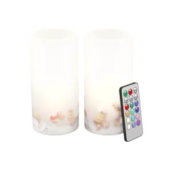 Add a uniquely beautiful, nautical touch to your home decor with the Seashell LED Flameless Candle Set (Set of 2) by Lavish Home. The coastal inspired, real wax candles are embedded with real shells to add a subtle ocean vibe to your home. The LED candles are battery operated and conveniently come with an 18-key remote, so you can easily control the power, timer, color, and the flickering or steady flame option with the push of a button. The candles have 12-color options, with a continuous setting or a multi-color changing sequence. This timeless candle set is sure to enhance any living room, bedroom, dining room or kitchen, and even makes a perfect gift for occasions like housewarmings, weddings, showers, birthdays, and more.