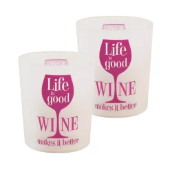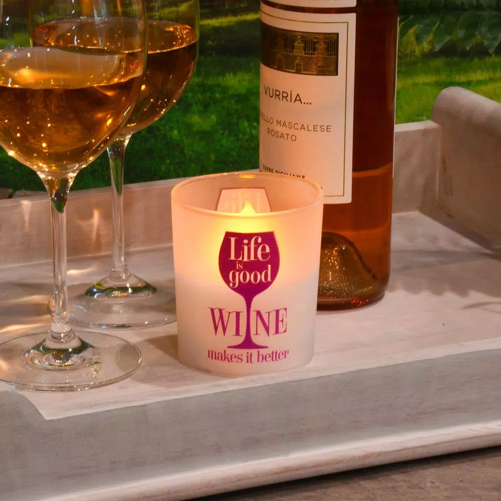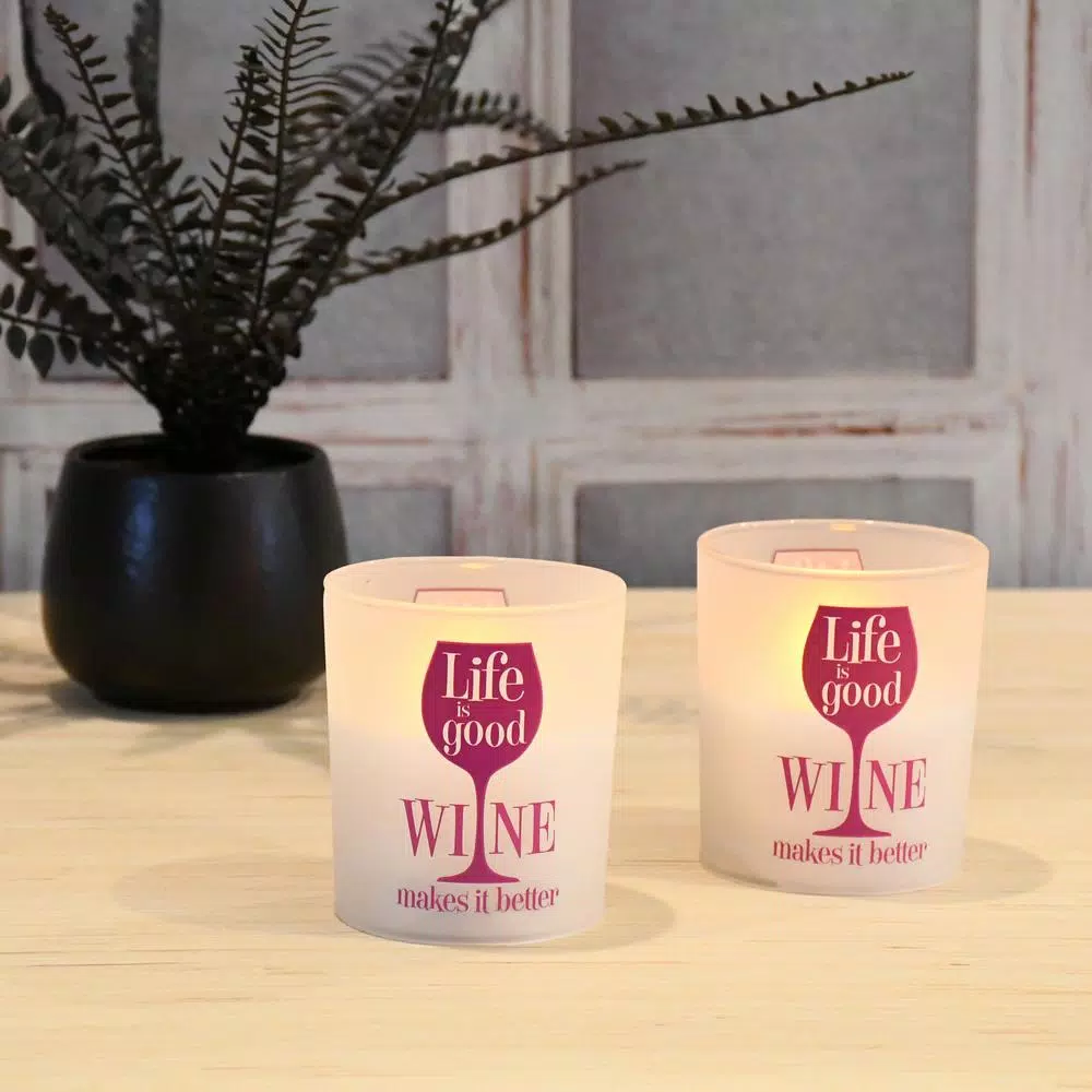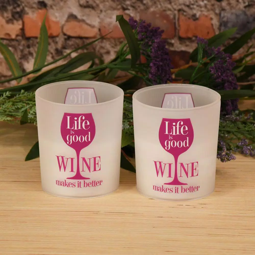 These trendy battery operated LED candles with “Life is Good Wine Makes it Better” printed on glass are perfect for the avid wine drinker. The frosted glass includes genuine poured wax and an enclosed glowing LED light. The lights have a convenient 6 or 8 hour timer. The natural glow adds ambient lighting to your decor. Requires 2 AA batteries.