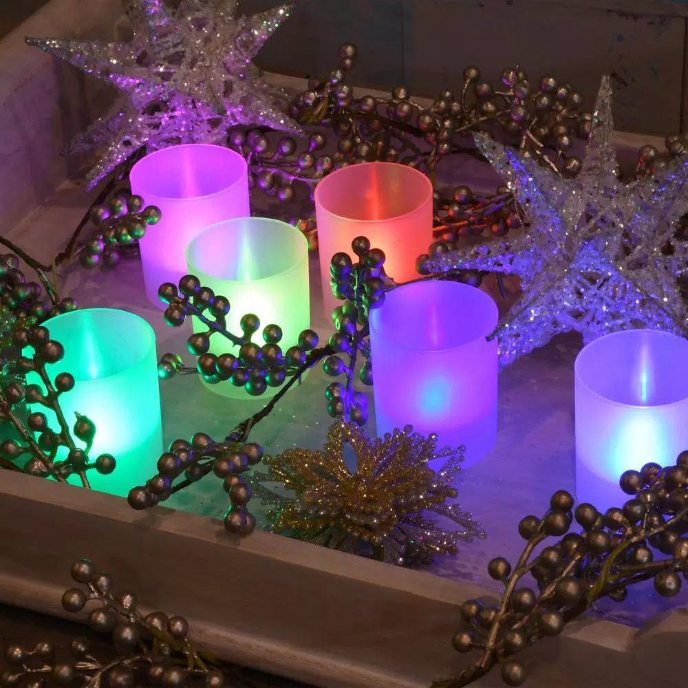 This set of 6 battery operated lights in votive holders add ambient lighting to your home decor. Inside each frosted plastic holder is an LED light that radiates a color changing glow. The 5 on / 19 off hour timer feature is ideal for window lights. Flameless candles are perfect for any event or occasion to add that special touch to your table setting, centerpieces or mantel.