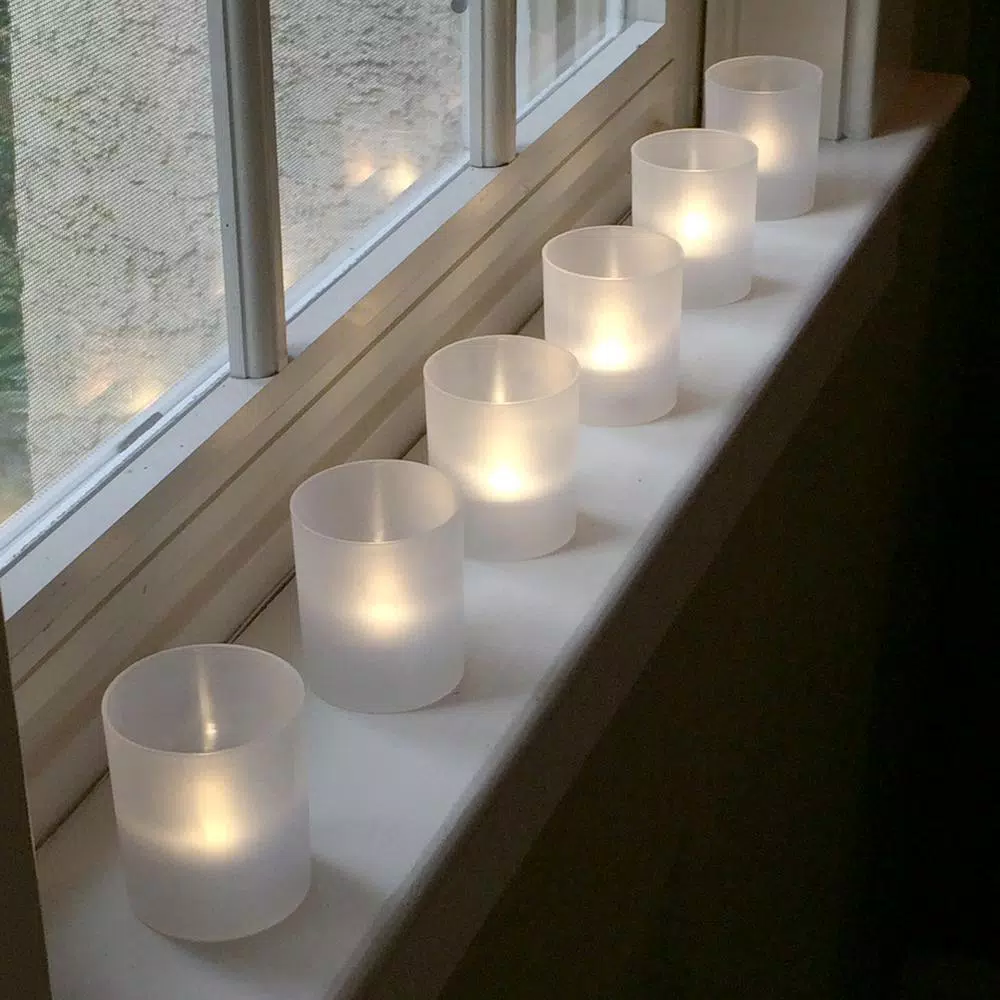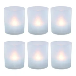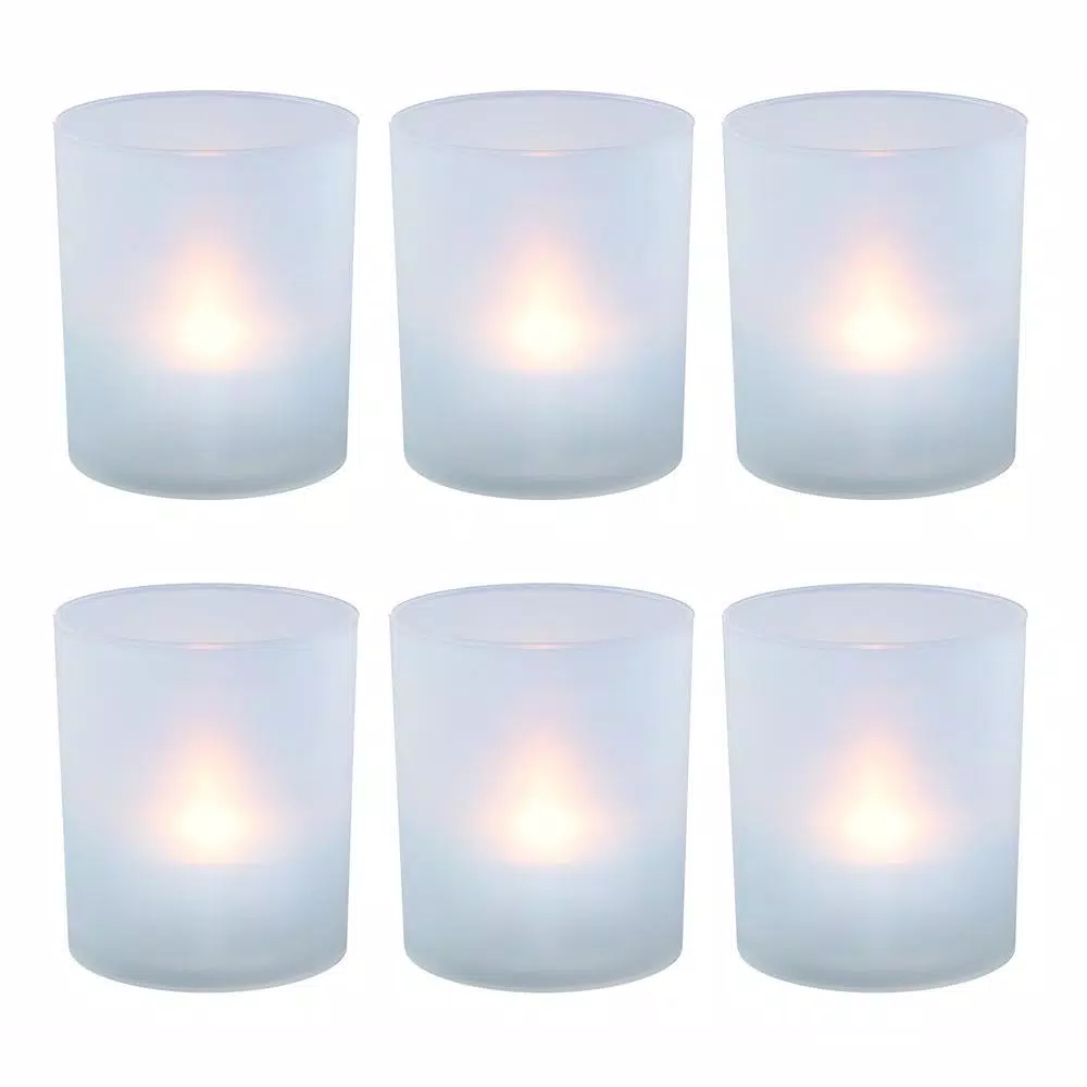 This set of 6 battery operated lights in votive holders add ambient lighting to your home decor. Inside each frosted plastic holder is an LED light that radiates a warm white glow. The 5 on / 19 off hour timer feature is ideal for window lights. Flameless candles are perfect for any event or occasion to add that special touch to your table setting, centerpieces or mantel.