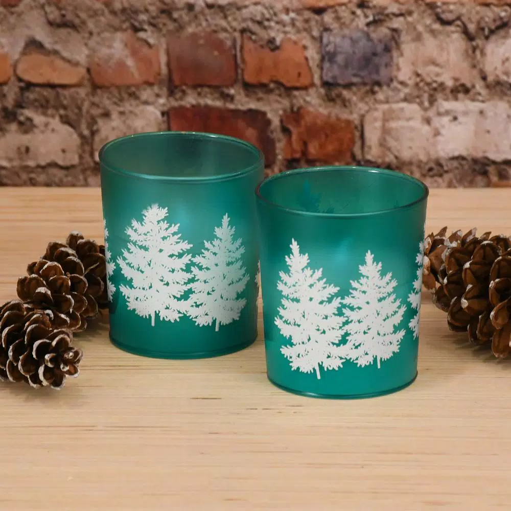 These lovely battery operated LED candles with pine trees printed on glass are perfect for your holiday decor. The green glass includes genuine poured wax and an enclosed glowing LED light. The lights have a convenient 6 or 8 hour timer. The natural glow adds ambient lighting to your decor. Requires 2 AA batteries.