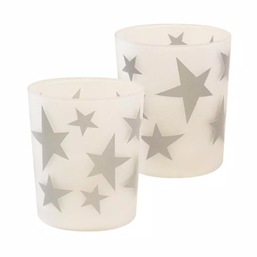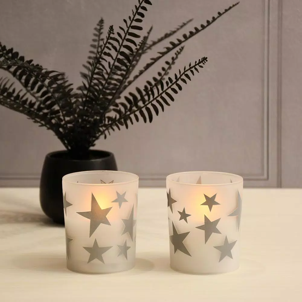 These lovely battery operated LED candles with silver stars printed on glass are perfect for your home decor. The frosted glass includes genuine poured wax and an enclosed glowing LED light. The lights have a convenient 6 or 8 hour timer. The natural glow adds ambient lighting to your decor. Requires 2 AA batteries