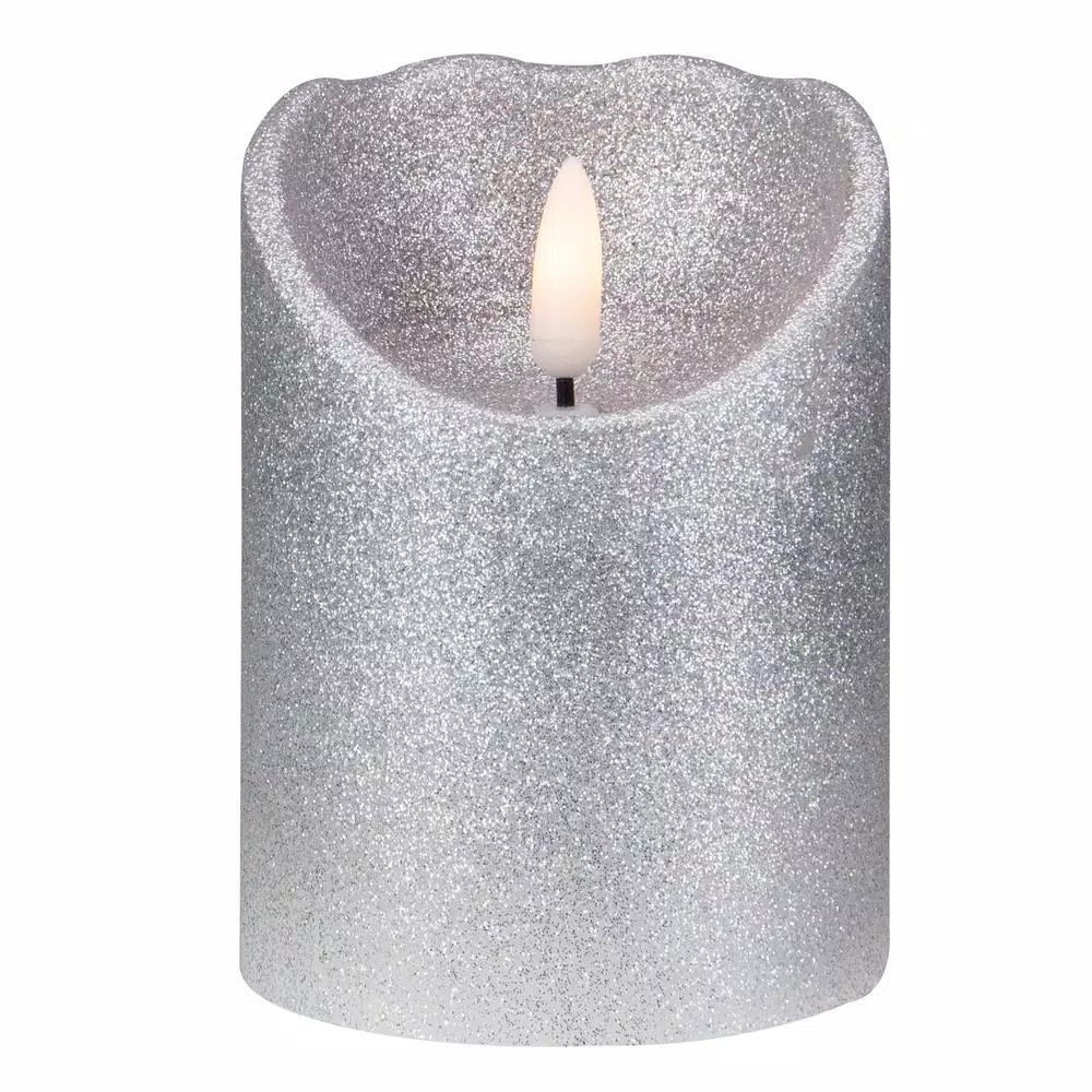 Add this battery-operated candle to your holiday decor. The candle is silver embellished with glitter features a melted edge design looks like a real candle that flickers with 3D lighting. You can Place them inside lanterns for a modern twist on classic style or use them with wall sconces to create dramatic accent pieces this Christmas. Features: Flameless Candle. Silver and embellished in glitter with a white tip. The candle glows warm white. Features an uneven oval top like melted wax. There is an on/off switch at the bottom. A battery insert is on the bottom (AA) batteries are not included. Feels like real wax. For indoor use only. Dimensions: 4″H X 3″W. Materials: plastic