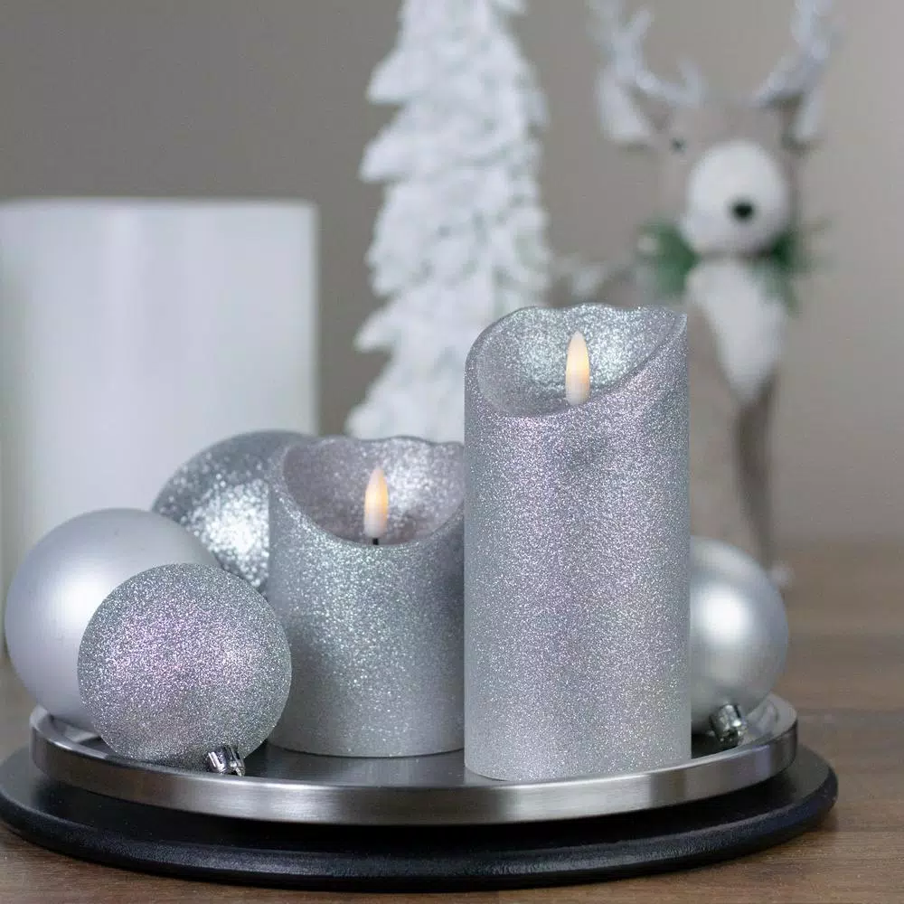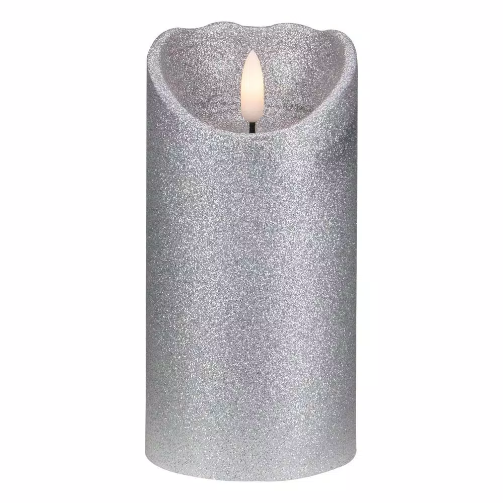 - The candle is silver with glitter but glows warm white