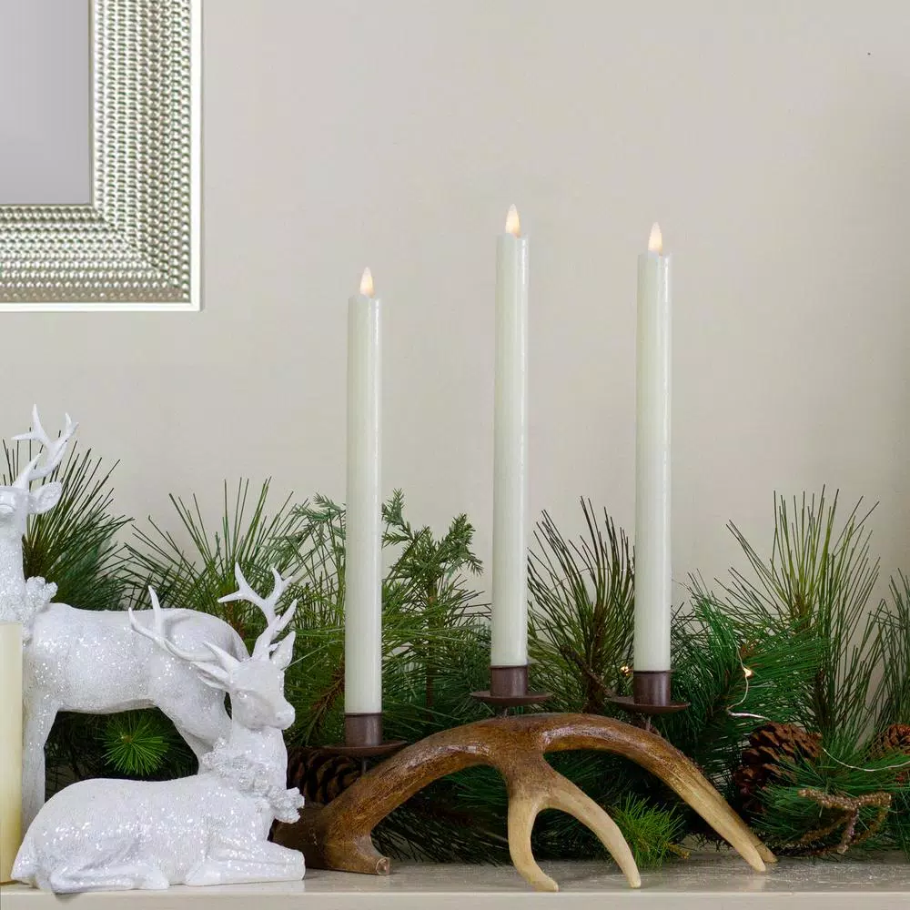 Add this battery-operated candle set to your holiday decor. The candles are pillars ivory in color looks like real candles that flicker with 3D lighting. You can Place them inside lanterns for a modern twist on classic style or use them with wall sconces to create dramatic accent pieces this Christmas. Features: Set of 2 flameless pillar candles. Ivory in color with a white tip. The candle glows warm white. This candle feels like real wax. There is an on/off push in button at the bottom. The bottom unscrews to place batteries into (AA) batteries are not included. For indoor use only. Dimensions: 12″H X 1″D. Materials: plastic