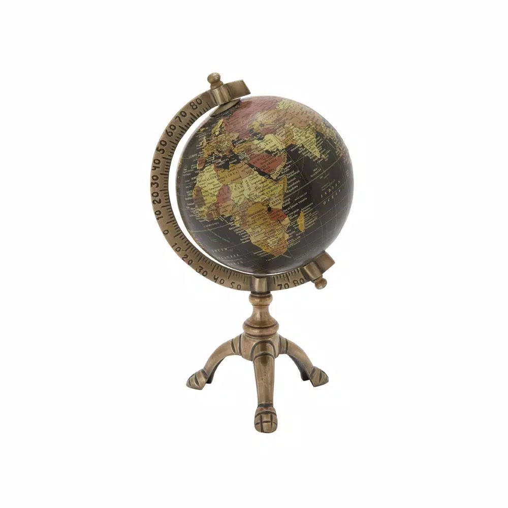 This decorative globe features a new traditional design with its oil-rubbed bronze finish. It depicts a detailed world map illustration in a vintage tone and a marked metal axis that bring out a perfect classic look. The carved tripod base is designed to provide a steady support to the globe.