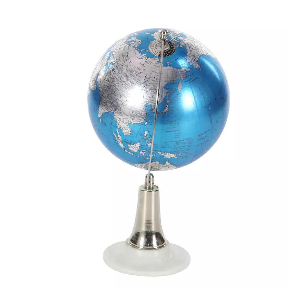 - 6″ x 11″ Modern Reflections metal, pvc and marble globe, polished blue and silver pvc globe, silver-finished iron axis with measurement details, bell-shaped silver-finished iron post, white marble base