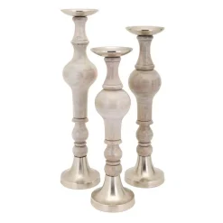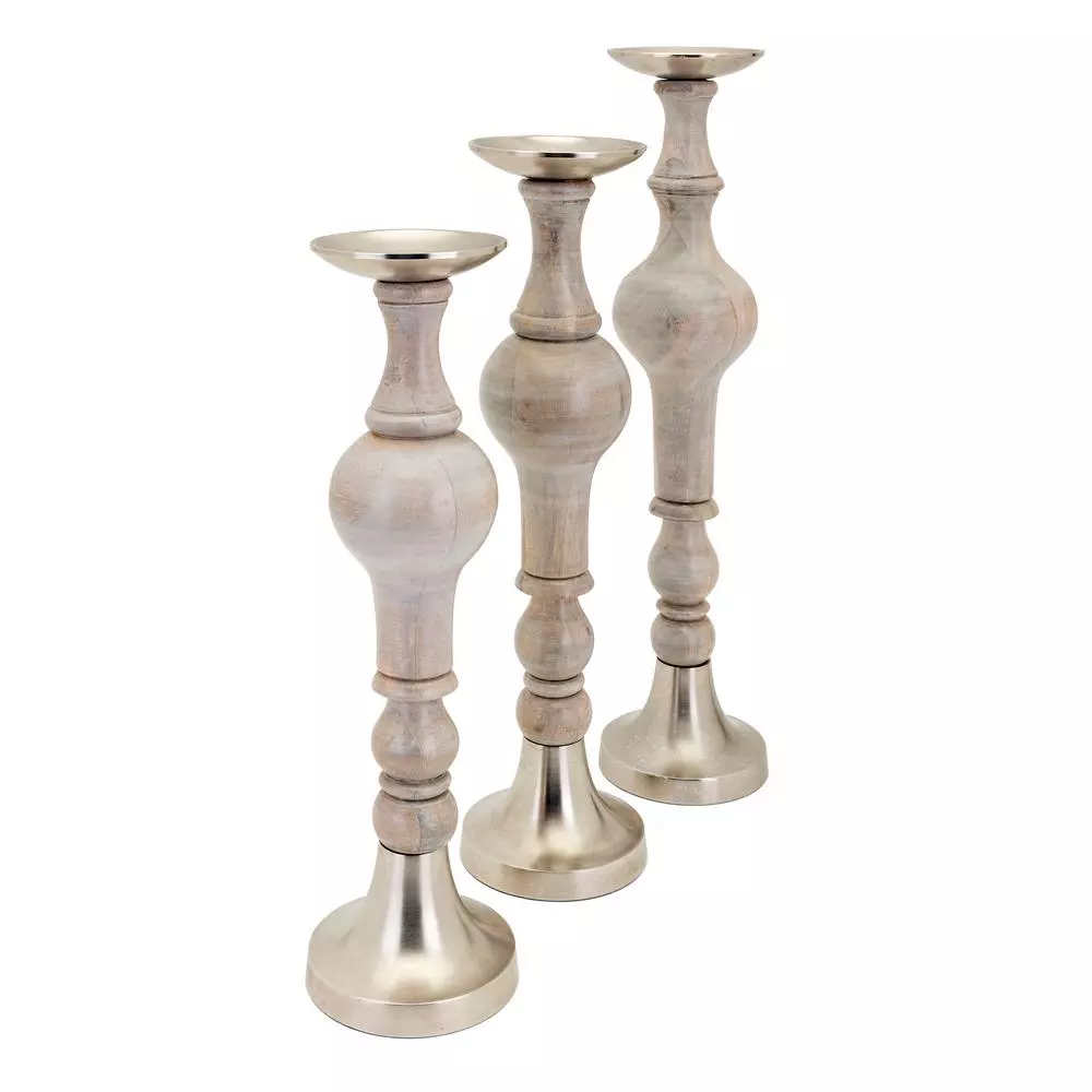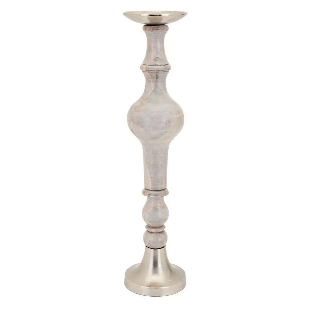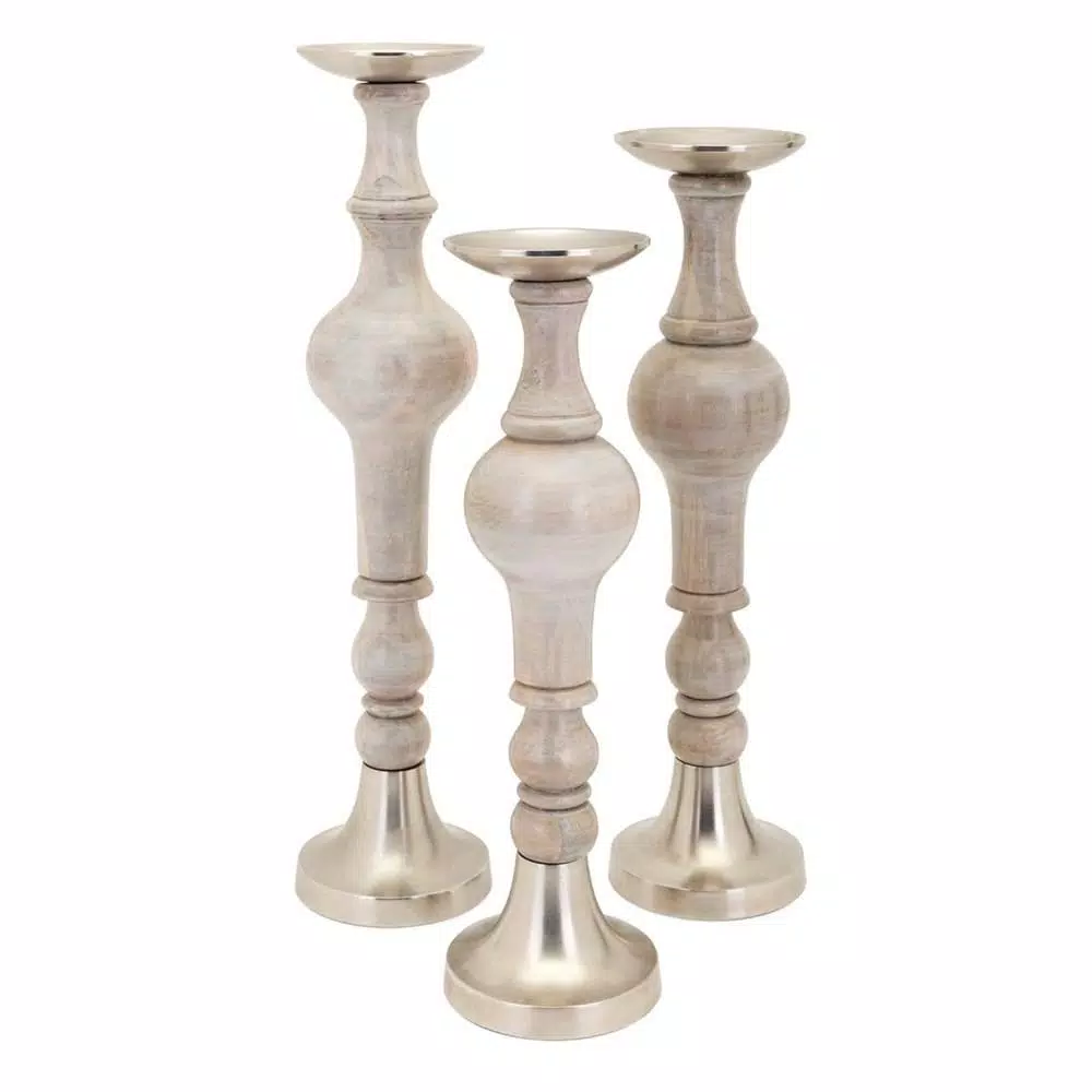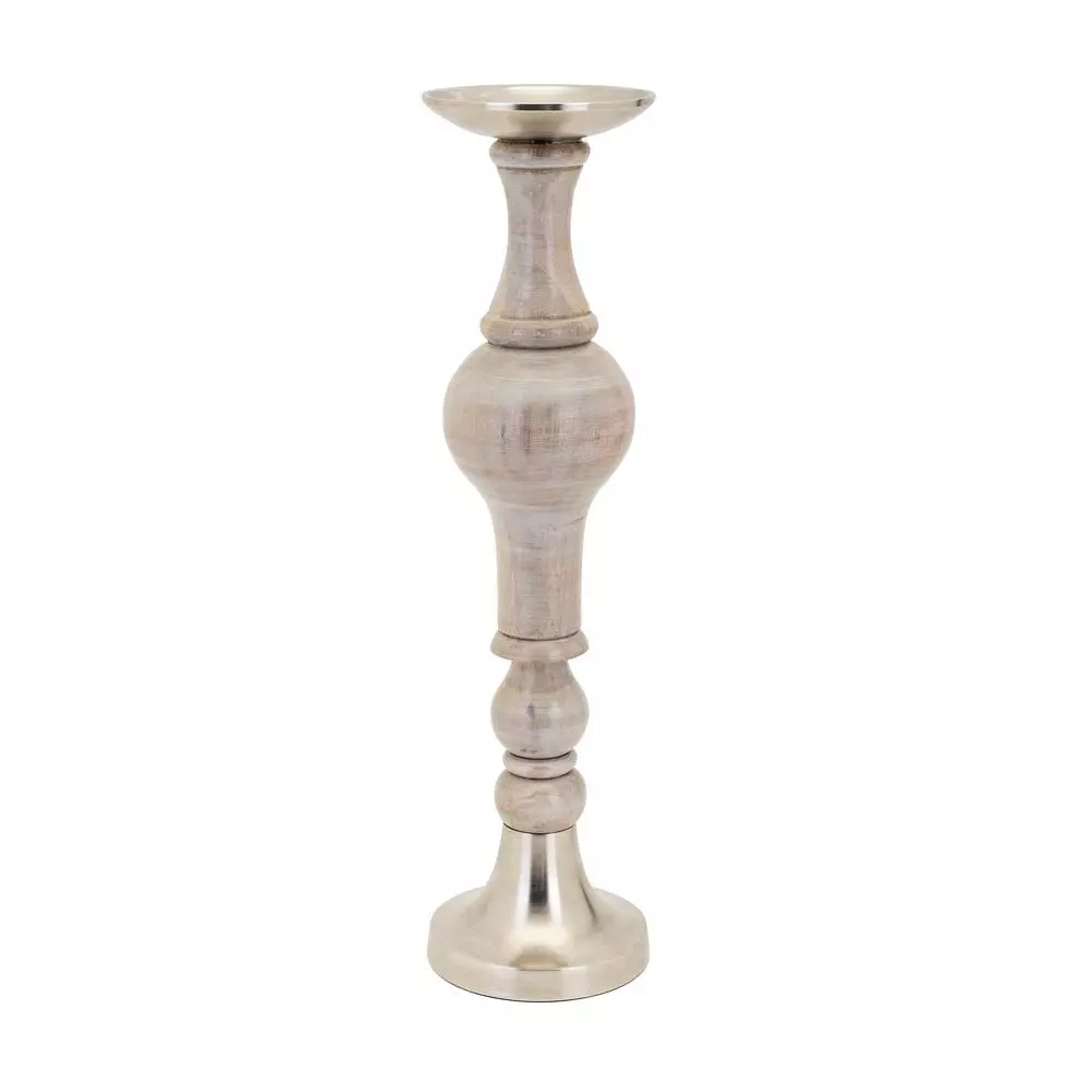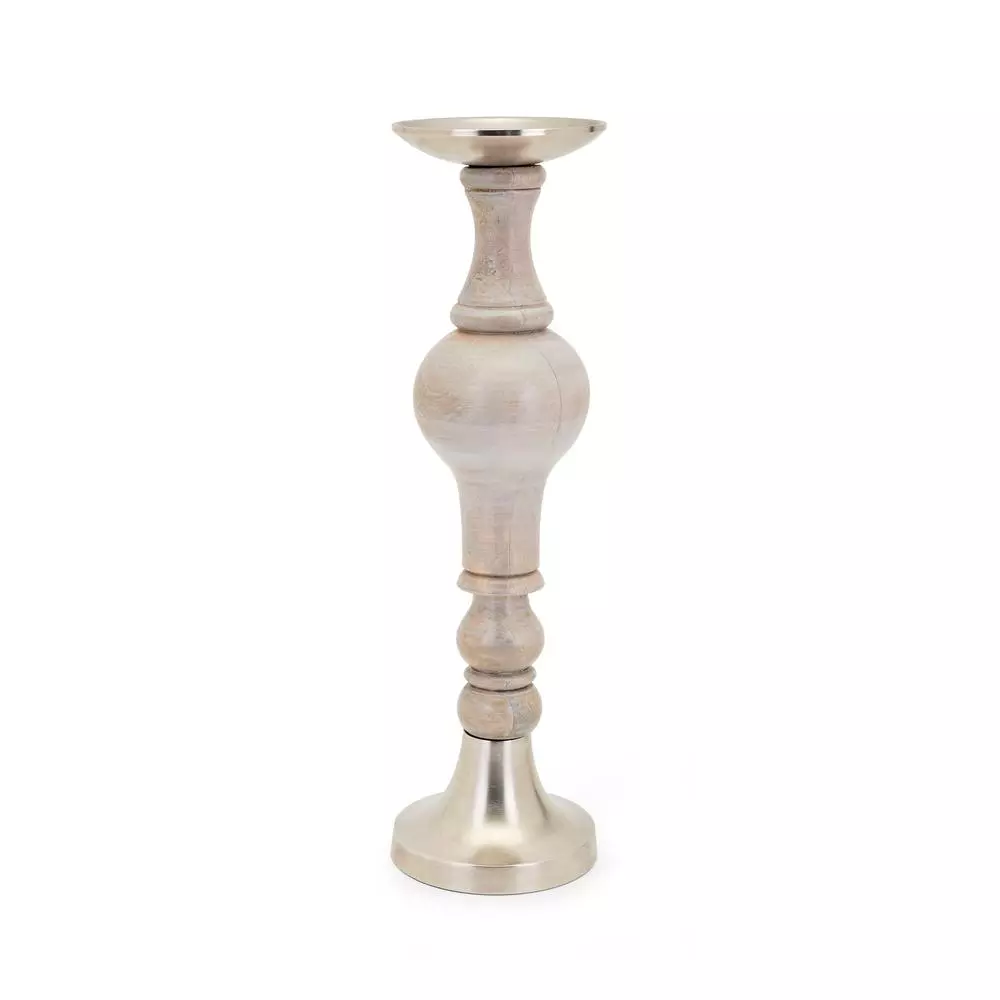 Brighten up your home with these Nightingale mango wood candleholders. Crafted from mango wood, these candleholders feature an aluminum sconce and base. Finely polished and coated this set of mango wood candleholders will add rustic charm to your home. Polished aluminum sconce partnered with a finely coated wooden body. Crafted with quality materials for lasting enjoyment and added value. Sized to create an eye-catching focal point in any room. Recommended placing two together for a more complete look.