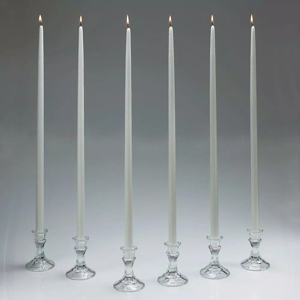 12 White Taper Candles 24 in. Great For The Holiday’s and for weeding and For All Year Round occasion, White Taper candle 24 in. Set of 12 From Shop A Candle. Quality Products and Quick Shipping. Taper Candles add elegance and sophistication to any formal event. Whether it be at a wedding, a reception table or just for a romantic candlelit dinner for that special someone, Taper Candles provide just the right amount of textured lighting for a dramatic presentation. Taper Candles make the perfect tabletop light for upscale restaurants and parties.Our Taper Candles are hand-dipped,” drip less” and “clean burning”. These Taper Candles have 100% lead free wicks and fit into any standard Taper Candle holder. Size: 24 in. Tall and 1 in. Thick.