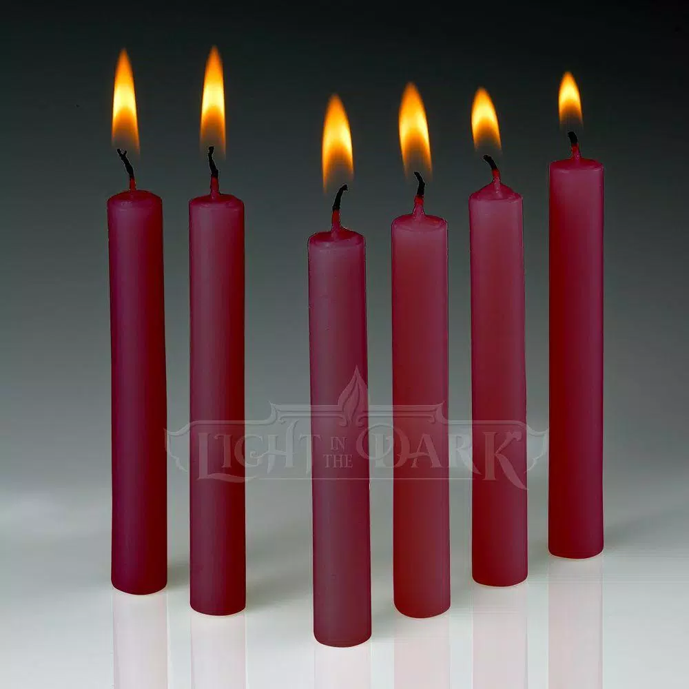 - Red taper candles 4 in. x 1/2 in. thick, burn 1-1/2 hour set of 60
