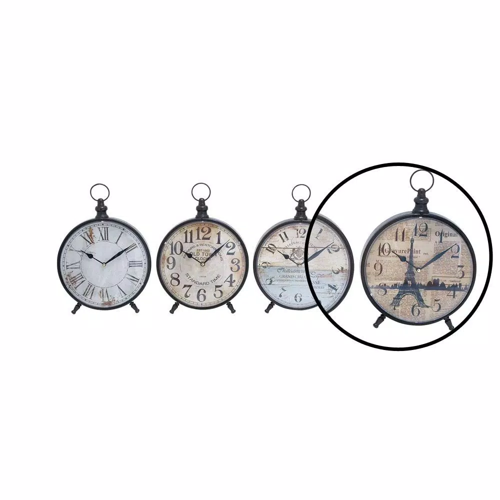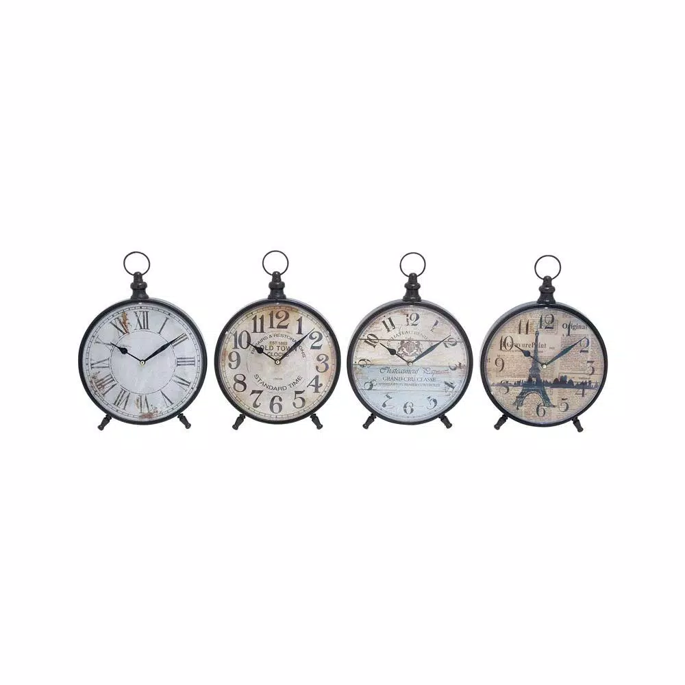 This set of 4 round table clocks features round white with brown rust, white with faded brown watermark, white wood plank and beige newsprint clock faces with European tour-inspired typography and illustrations, bringing vintage vibes to homes and spaces. These clocks are designed with circular clock frames with loop and knob finials and peg feet that provide stability and sturdy support. The distressed black and white finishes of these table clocks add elegant rustic vibes that suit shabby chic and country style interior design settings.