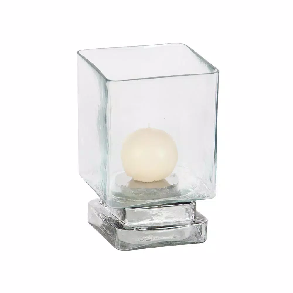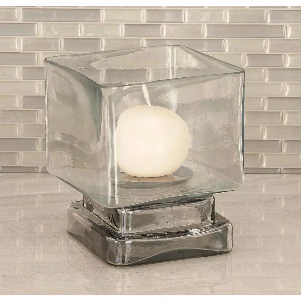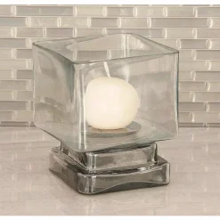 - Cube-shaped glass shade protects a lighted candle from drafts