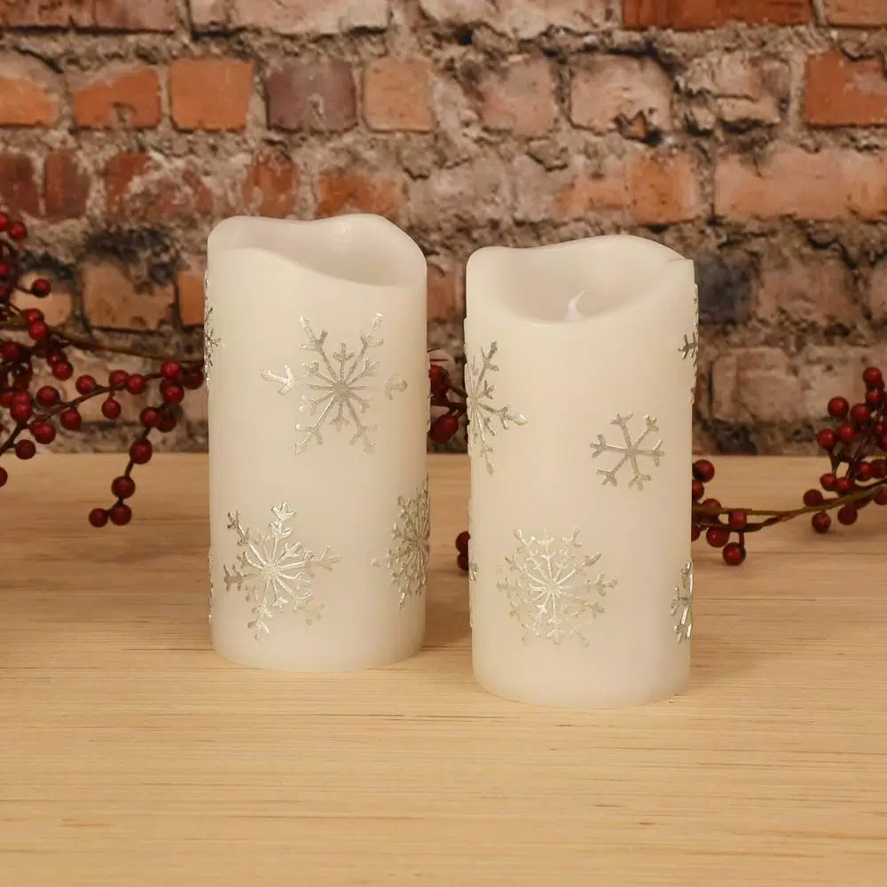 The beauty silver snowflakes set into white battery operated wax candles will add a elegant touch to your decor. The flickering amber glow adds beautiful ambient lighting to your next event, occasion or everyday home decor. These LED candles have a convenient timer incorporated, 6 hours on / 18 hours off. Get the classic soft flickering glow of a candle without any drips, smoke or flames.