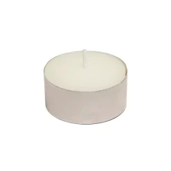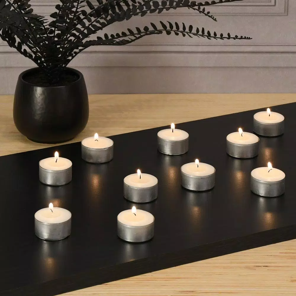 This set of 100 unscented extended burn tea light candles will burn for up to 7 hours. They are made from the highest quality wax for a clean burn. They come in a metal container for easy replacement in any candle holder.