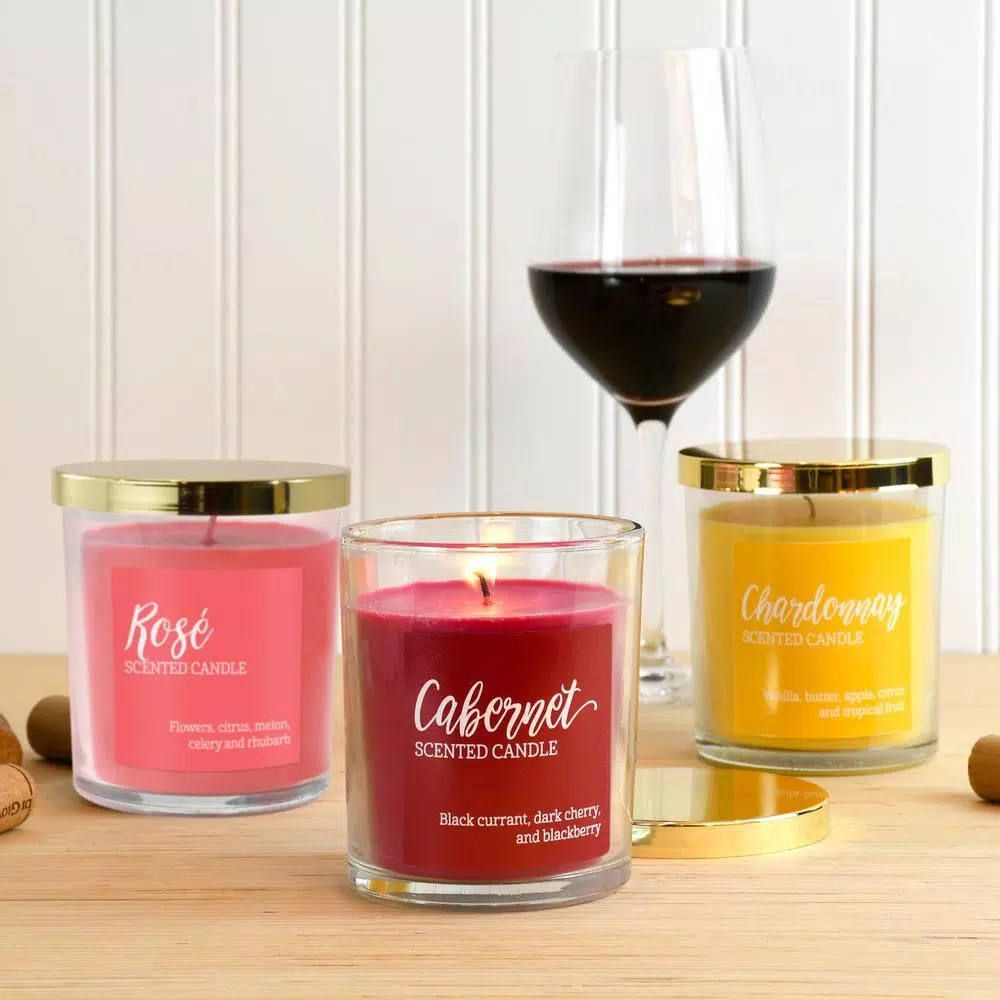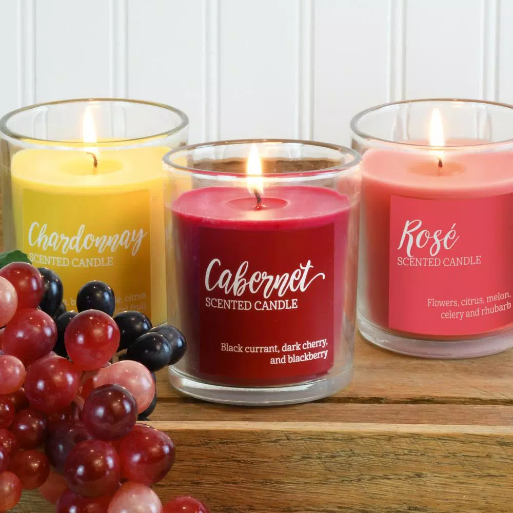 The Wine Scented Candle Collection offers three lush fragrances in vibrant colors. Cabernet is a decadent combination of black cherry, currant and blackberry. Chardonnay is full of tropical flavors, apples and earthy Fall aromas. Rose offers a luscious fusion of citrus, cherry blossom, hydrangea and a delightful fruitiness.