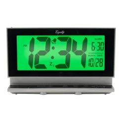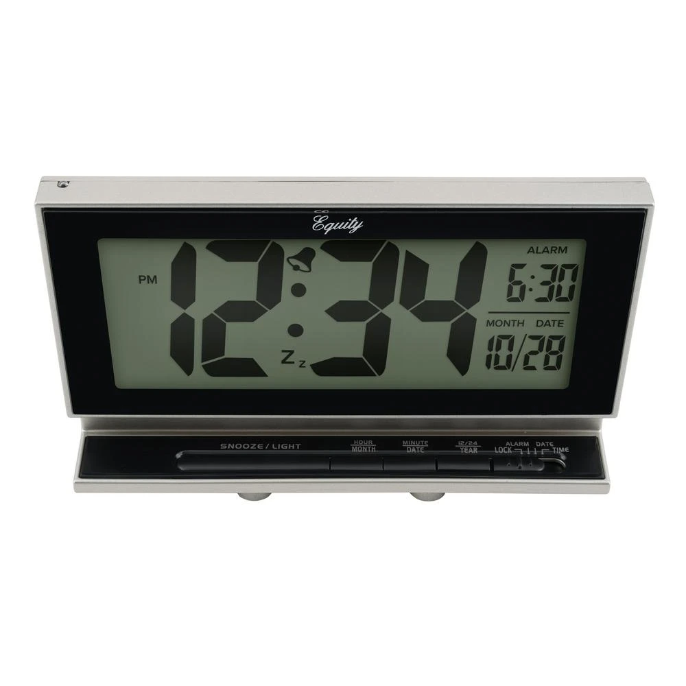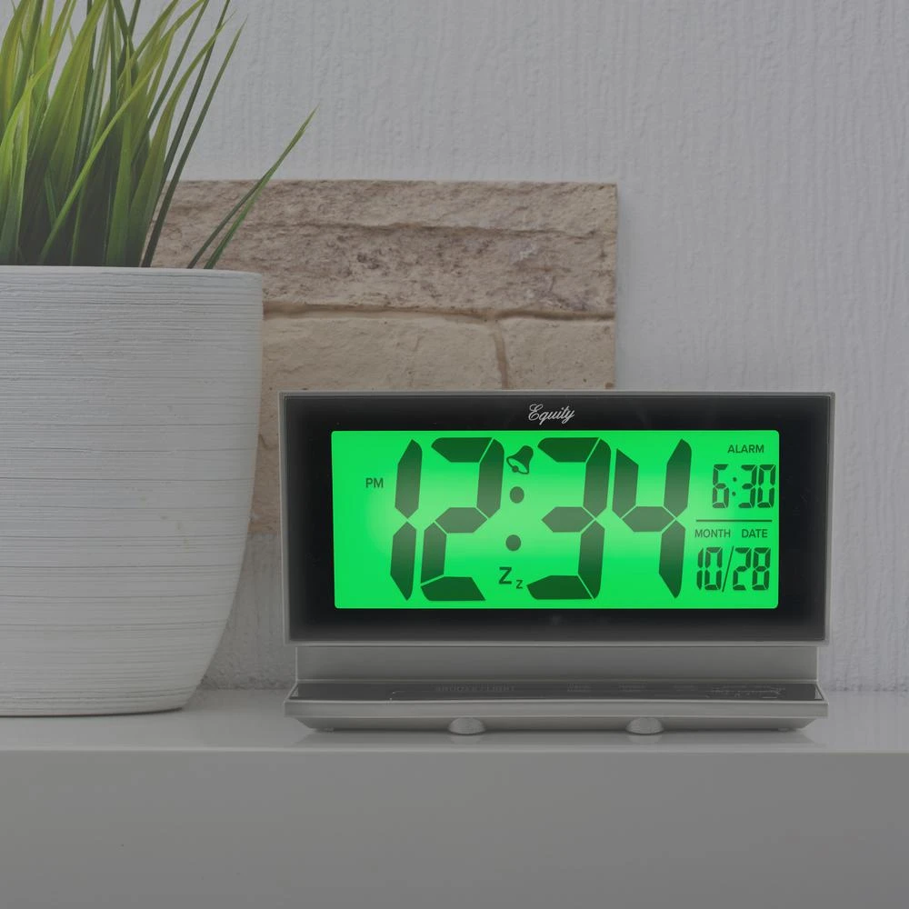 Simple and easy to read. Take this portable battery powered alarm clock with you wherever you go. No cords to worry about. Its jumbo display makes it easy to check time and date at a glance. Night vision technology ensures just the right amount of backlight. Sensor adjusts to ambient light so you can see time and date comfortably, day or night. Ascending alarm with 5 minute snooze to keep you on time. Requires 3 AA batteries (not included).