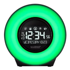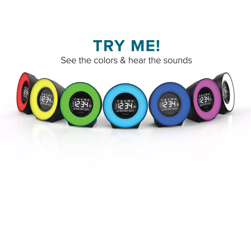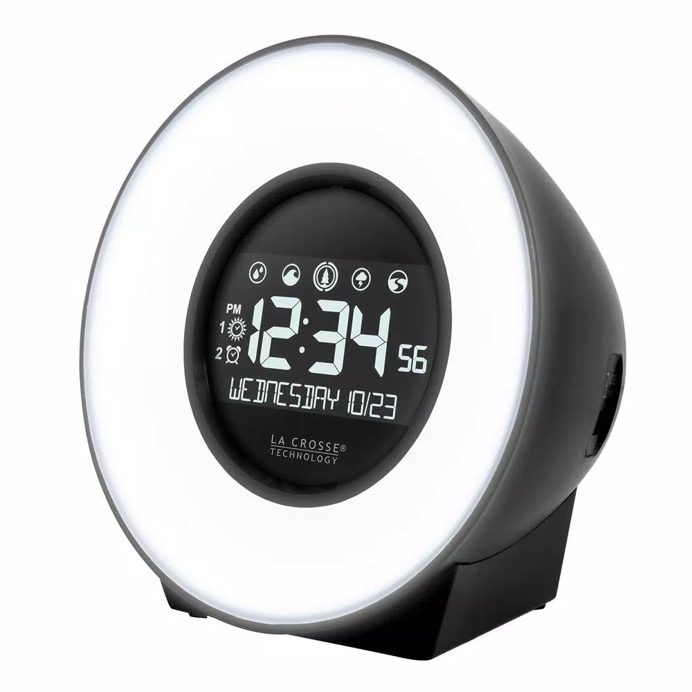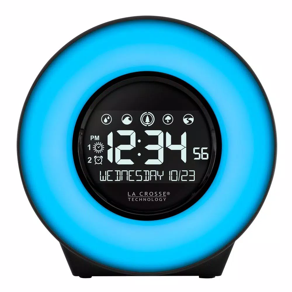 Uniquely designed Mood Light Alarm Clock, equipped with a variety of nature sounds to soothe even the most stressful of days. This easy-to-use alarm allows you to choose from seven different light colors depending on your mood, or if you cant decide on one, simply set it to cycle mode and watch as the colors fade into the next. We know how difficult it can be to sleep with a bright light next to you in bed, so not only was it designed with five different brightness level settings, but as was the LCD display. Fall asleep to the soothing sound of a flowing river, and wake up to seagulls chirping while ocean waves crash into a beach. With five different nature sounds to choose from, you will wake up as peacefully as you fell asleep. Before heading to bed, use the sleep timer to program a nature sound of choice to play for 15 to 90 minutes before bed, and dont forget to set your snooze timer if youd prefer 10 more minutes of sleep. Whether you need a quick break before dinner or in between classes, the nap timer allows you to take a 5-120 minute nap without disrupting your previous set alarms. Here at La Crosse Technology, we will always design with you in mind. Use the USB charging port to power your phone or other device without taking up unnecessary space on the outlet. Padded bottom keeps the alarm from sliding while programming or hitting the snooze button. The Mood Light Alarm Clock with Nature Sounds makes the perfect addition for any age group.