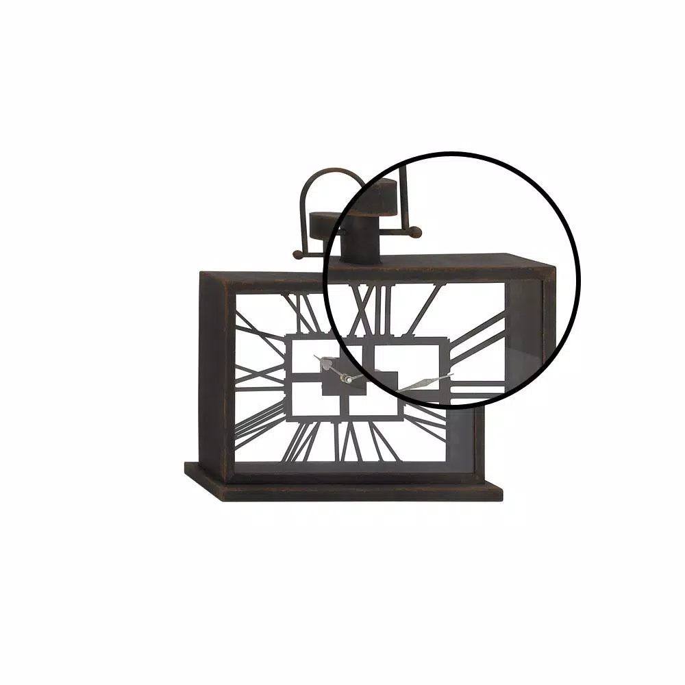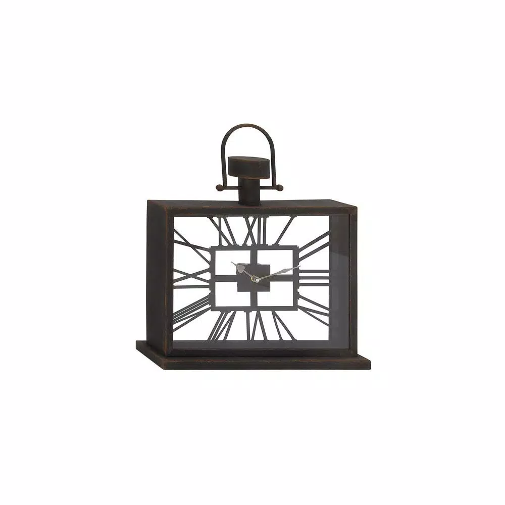 This rectangular table clock features a horizontally oriented clock face with cutout Roman numerals around a center square inside a clear glass cover that conveniently operates on 1AA battery. This table clock is designed with a sturdy rectangular band frame with a decorative top winder and an arched band handle mounted on a rectangular base for stability. This table clock’s rusted black iron and smooth glass finishes create contrasting features and bring elegant rustic vibes to homes and spaces.