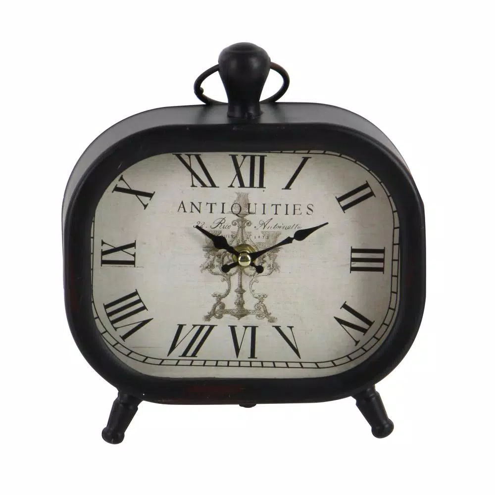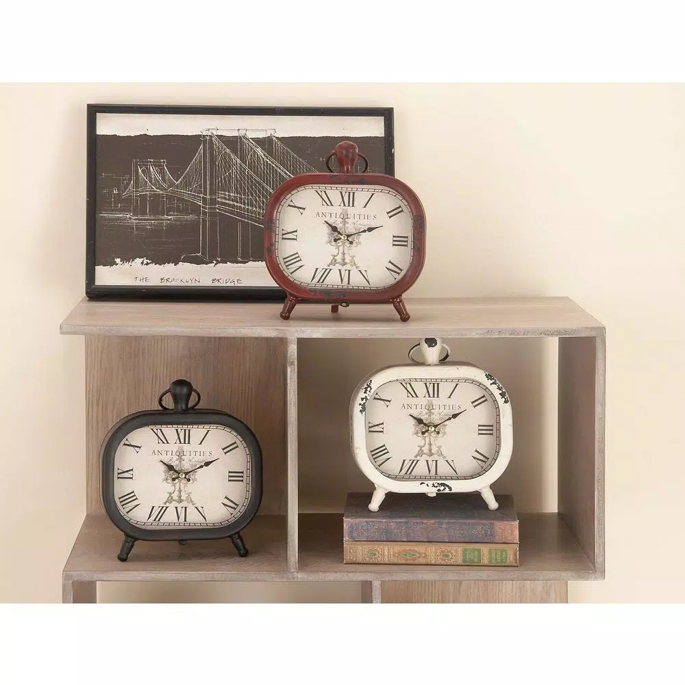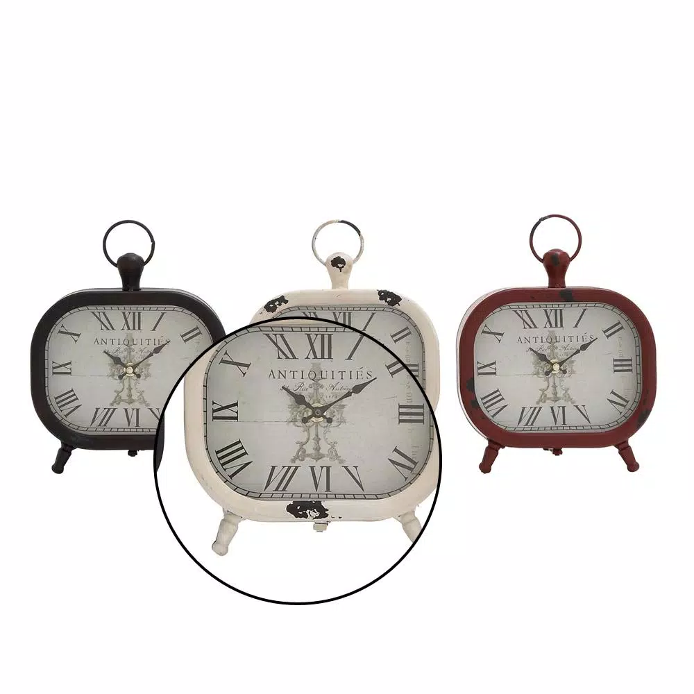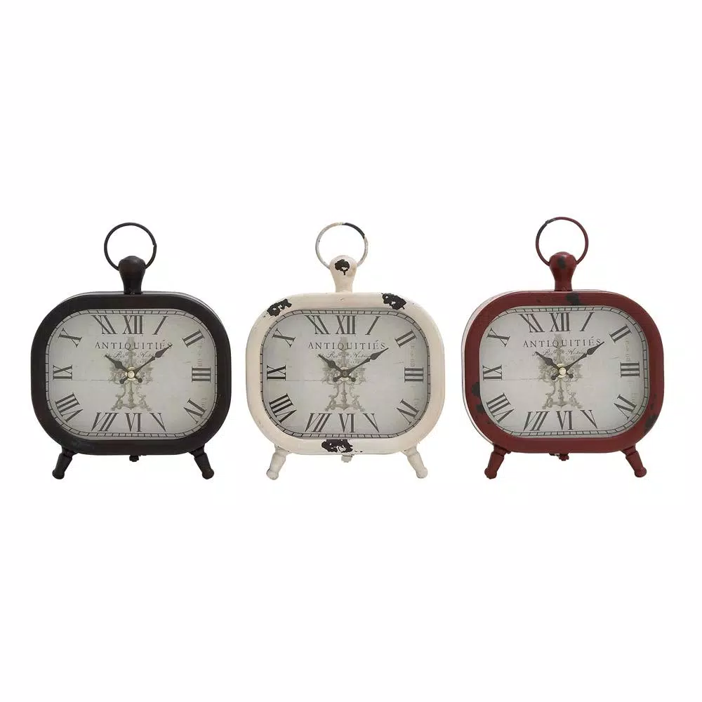 These three assorted table clocks feature rounded rectangular frames in a distressed and chipped paint finish. Each clock is designed with classic black Roman numerals against an off-white clock face. These decorative clocks are embellished with knob and iron loop finials for a touch of elegance.