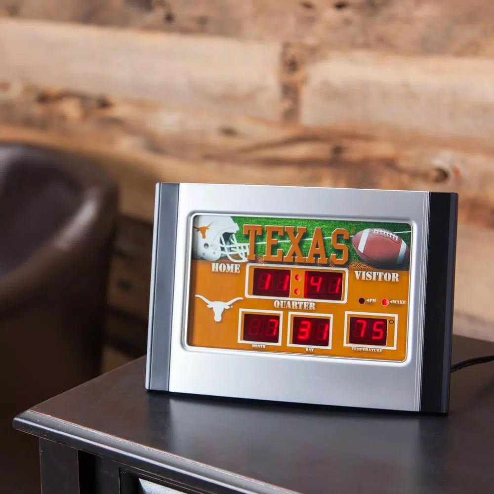 This desk/wall clock is sure to be a hit for any sports fan. This clock is designed to sit upright on a desk, but can easily be hung on a wall as well. It features 3- alarm sounds: a beep, a whistle, and crowd sounds. Clock is designed to look like a scoreboard and displays the time, the day and month, and temperature in Fahrenheit. It also features eight various tunes and sounds. UL certified, plugs into a standard outlet. Makes a great gift.