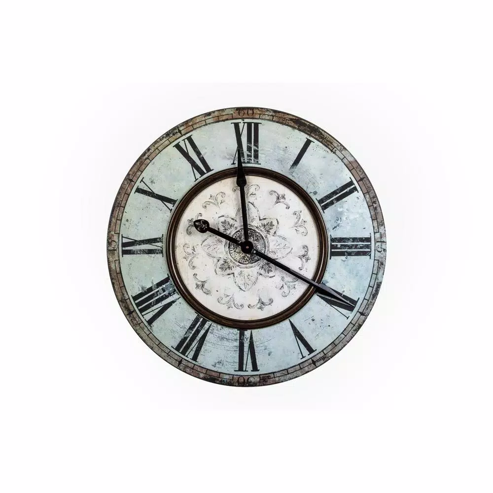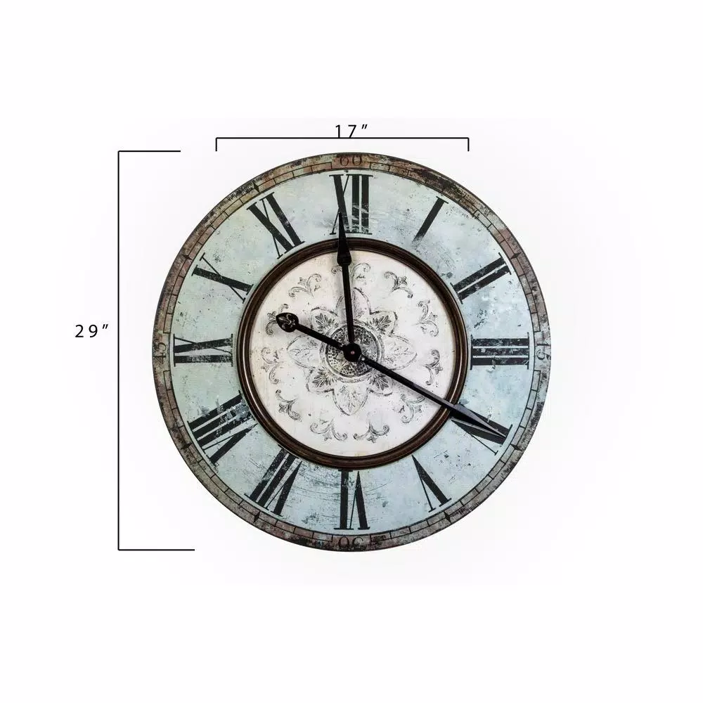 A captivating timepiece, this 29-inch wall clock stylishly pays homage to French country style with elegance. Especially fitting for an empty wall space, this wooden piece effortlessly draws the eye with its bold Roman numerals and matching clock hands that hover over a pale aqua and ivory-colored face. Its fleur-de-lis and floral details are a harmonious match for a romantic and feminine aesthetic in the living room, which is easily complemented by other weathered décor and Parisian countryside-inspired prints. Looking for a more neutral cottage aesthetic in the master suite? Set it on an understated white wall, pair it with a few faux floral wreaths, then round out the look with a simple woven wool rug and potted lavender vases.