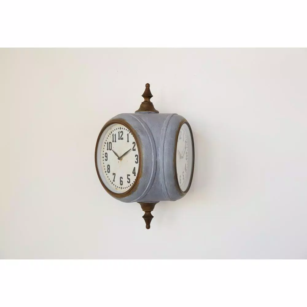Wow!! This is a perfect conversation starter when company is over. The amazing two sided clock has a grey finish with brown accents which create such a fantastic finish. Your guests will admire and envy this clock decor. Requires 2 AA batteries.
