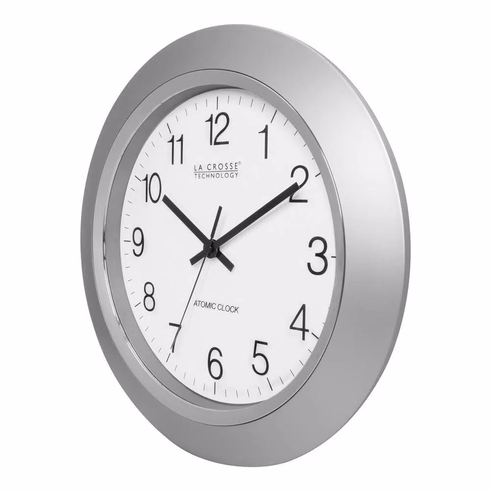 Silver frame clock with chrome rim gives you accurate atomic time and automatic updates during daylight savings. Requires 1 AA battery and simple button operation. 4 US time zones and on/off daylight saving button.