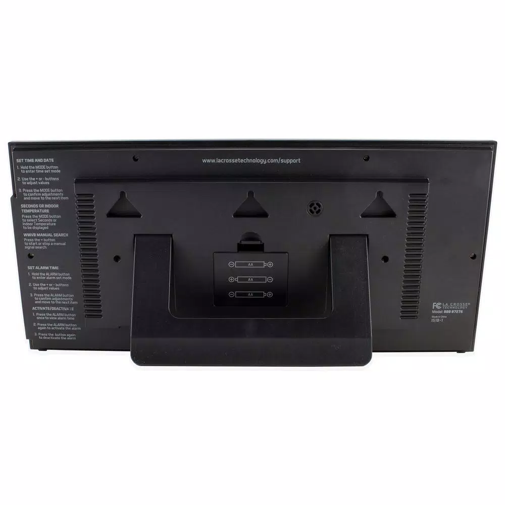 Extra-large atomic digital clock can be seen from across the room or down the hallway. Self-setting time to any of the seven different USA time zones, or if out of 2,000 mile radius of WWVB radio signal range may be used as quartz manual set clock. Optional 12 or 24-hour time viewing mode and temperature settings shown in Fahrenheit or Celsius. Battery operation (requires, not included 3 AA) so is wireless to place almost anywhere. Can be hung onto either a wall or stand on countertop. Icon indicators will show active alarm or WWVB signal or if low power, so you can replace the batteries.