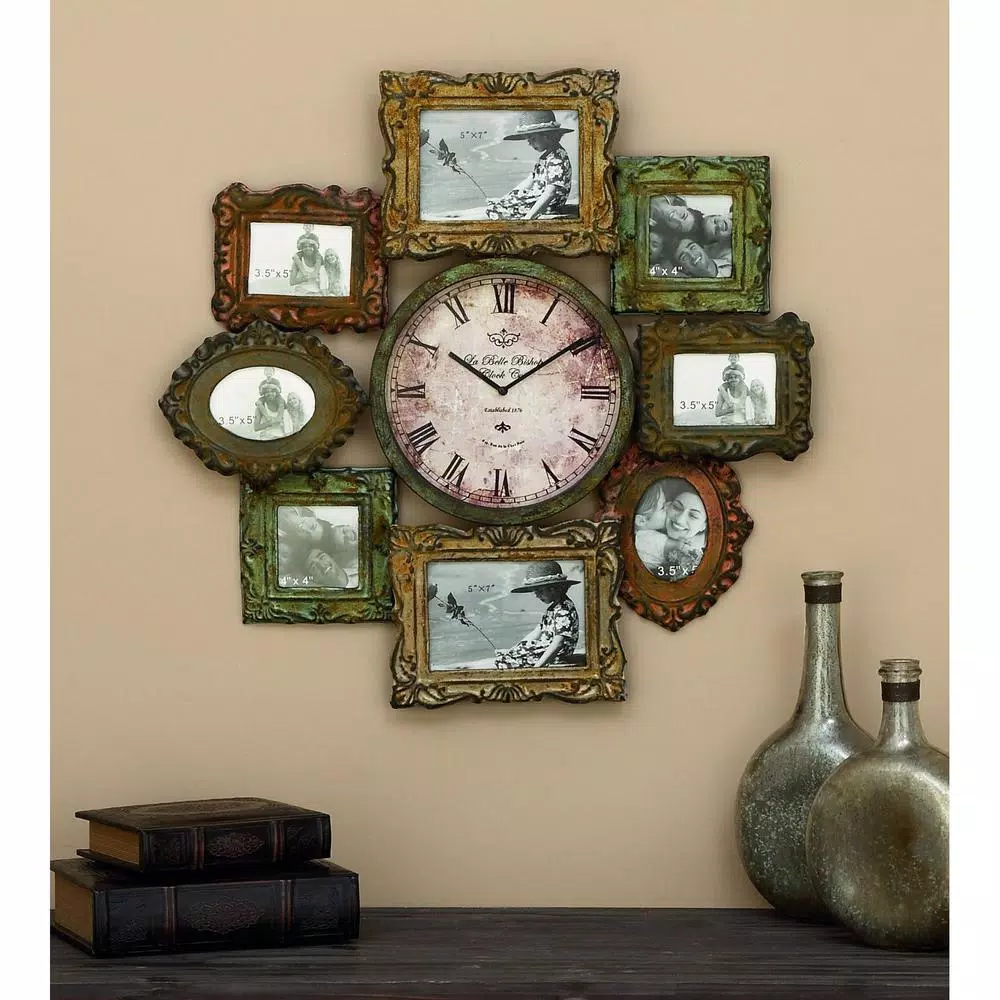 This Victorianesque wall Montage of 8 photo frames and Center Clock sits an impressive 25 in. high. It boasts dramatic finishes, using Distressed Ivory, Verdigris and Russet Hue Iron colors. Added embellishments include Vintage Style Graphics, Scalloped Relief Frame Moldings and Roman numerals.