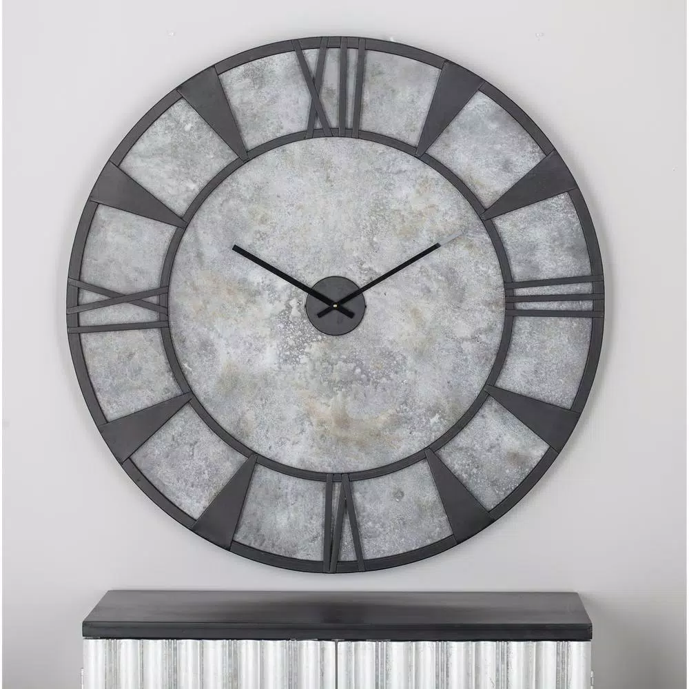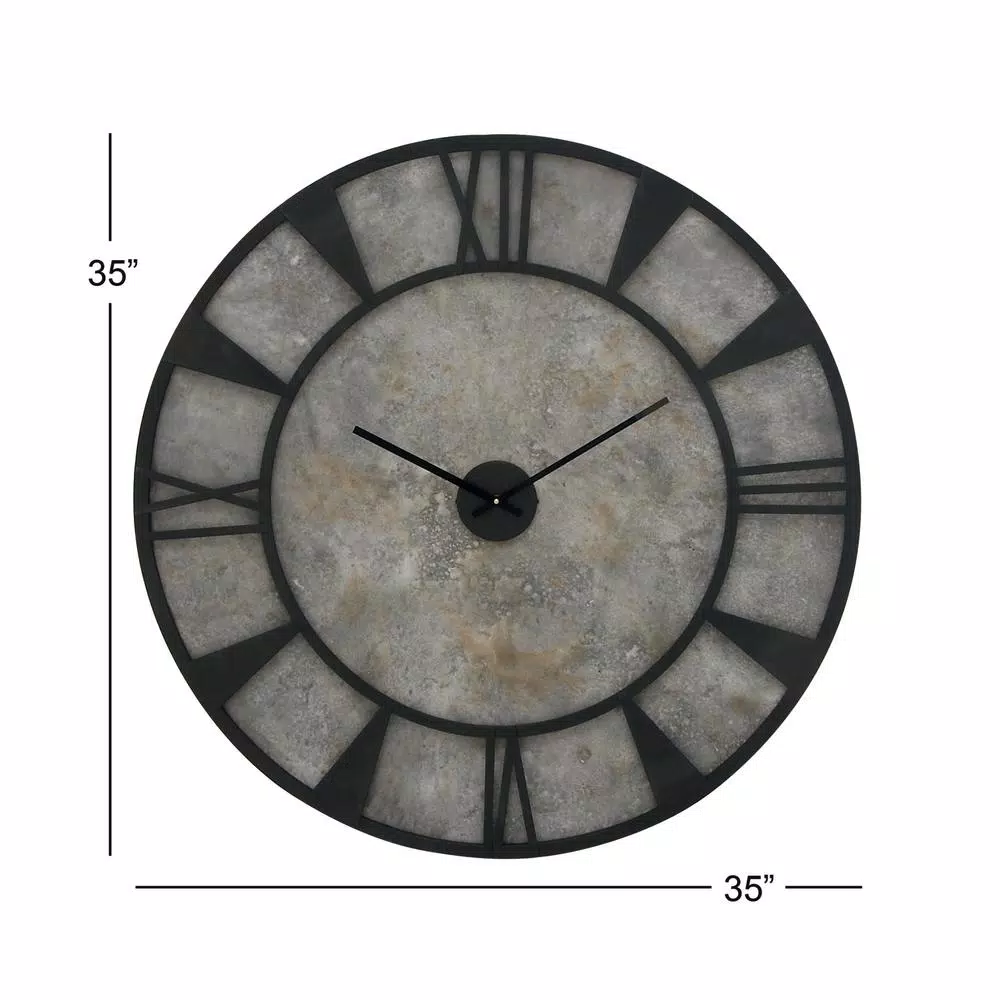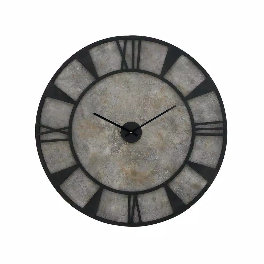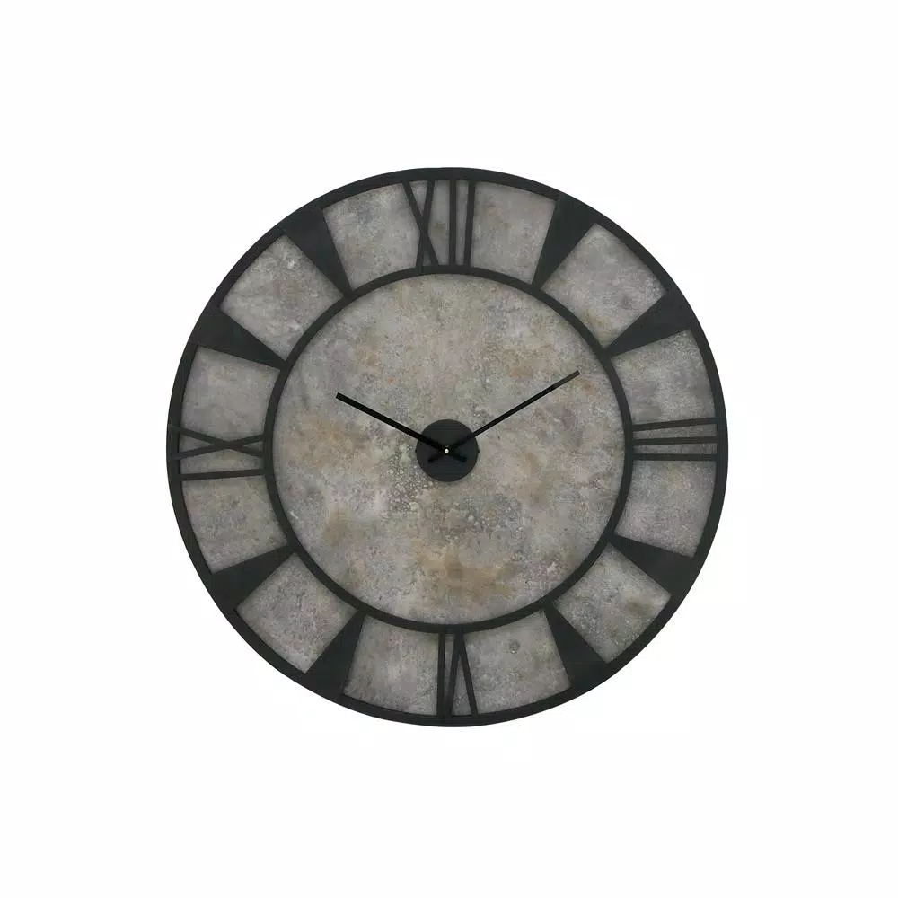This modern wall clock features a unique design. The black iron frame and the stone gray clock face adds a contemporary vibe. This modern piece will work well in any modern home or office.