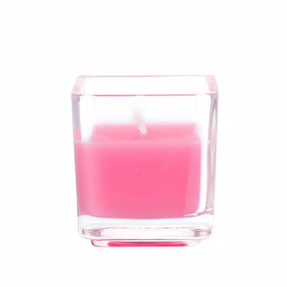 - Candle resides in a square glass container